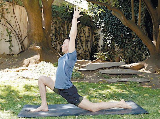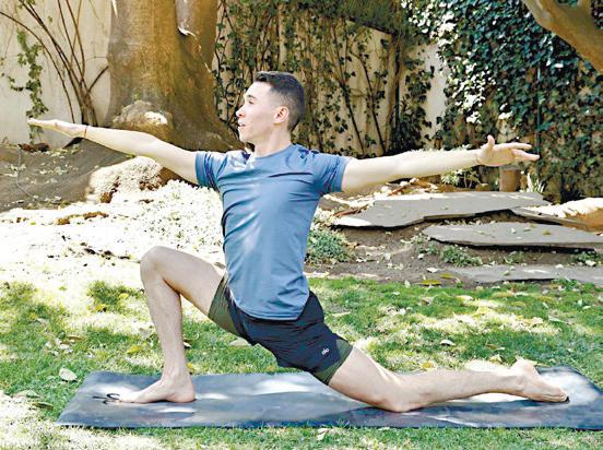 z Inhalas y dejas caer tu pie de atrás, inhalas nuevamente y levantas los brazos en postura de corredor. Si esto molesta mucho, te puedes quedar con la rodilla en el piso o con el empeine, y bajas cadera, inhalas y abres pecho en la exhalación, y puedes llevar la mano derecha al piso y el brazo izquierdo hacia arriba.
