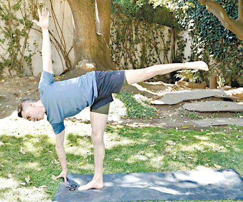 z En la exhalación llevar las manos al piso y te puedes quedar ahí fortaleciendo tu pierna derecha, levantando más la izquierda y sueltas el peso de tu cabeza y te pegas lo más posible: puedes caminar con tus manos.