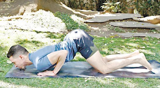 z Con las rodillas al piso, inhalas, vas a arquear la espalda y te puedes quedar así, o puedes llevar la barbilla al piso y aquí fortaleces tus brazos.