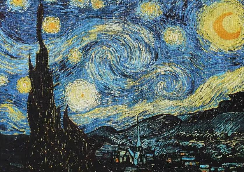 La luna, el pueblo, las estrellas, el cipres, las montañas, la iglesia y los espirales de viento.