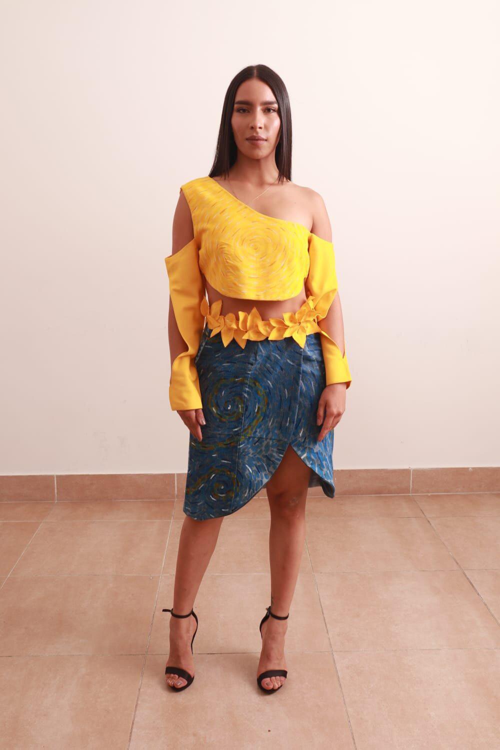 Teniendo en cuenta lo anterior, para la blusa, se toma como referente “La Luna de Van Gogh”, evocando de forma literal su estructura y lo abstracto que era el pensamiento del artista en su momento de creación, logrando asi, unas mangas con abertura superior, hombros descubiertos y dinamismo en cada curva generada.
