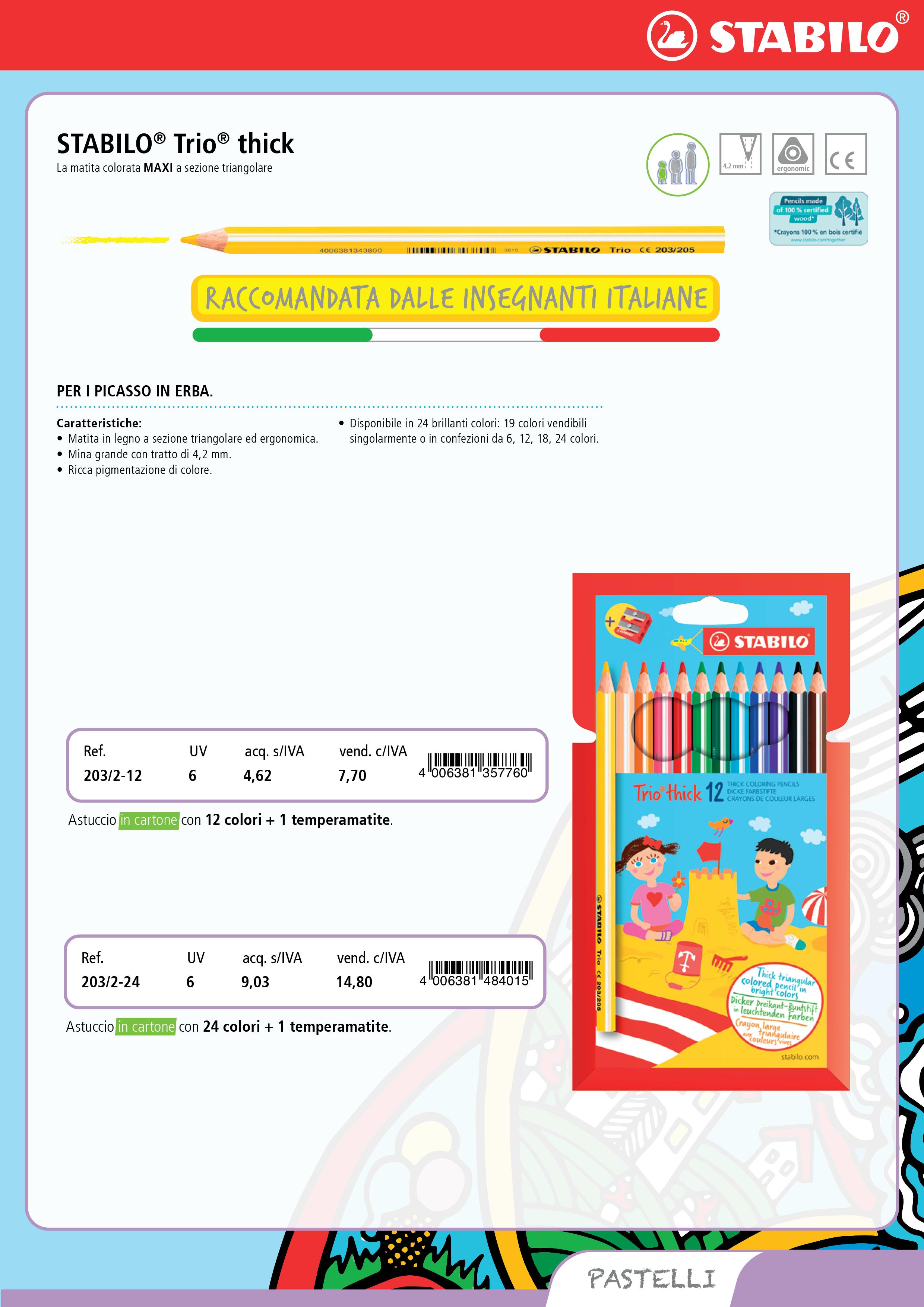 Composto da 2336 pz in 14 referenze nei colori assortiti e 18 scatole pastelli TRIO THICK