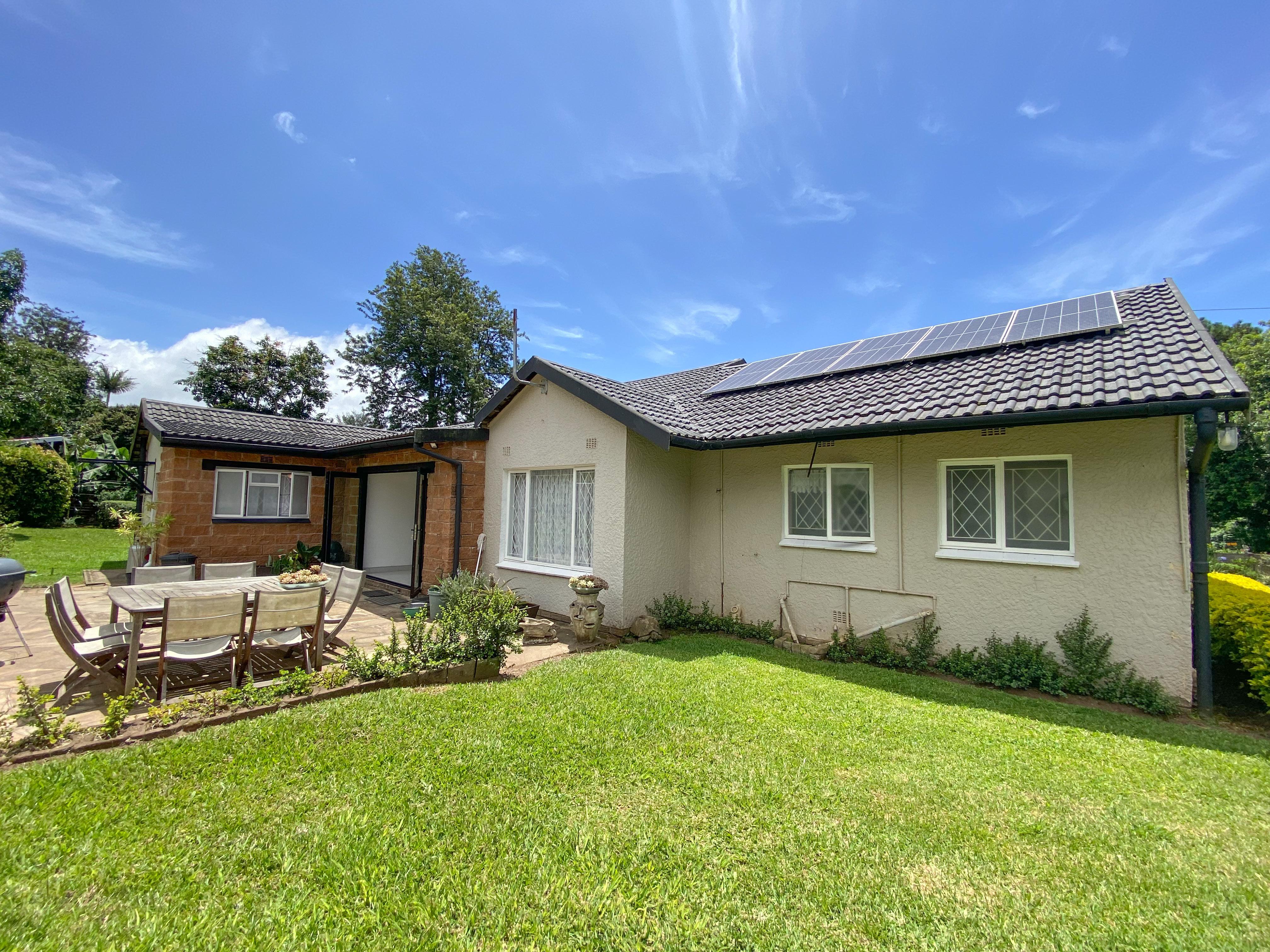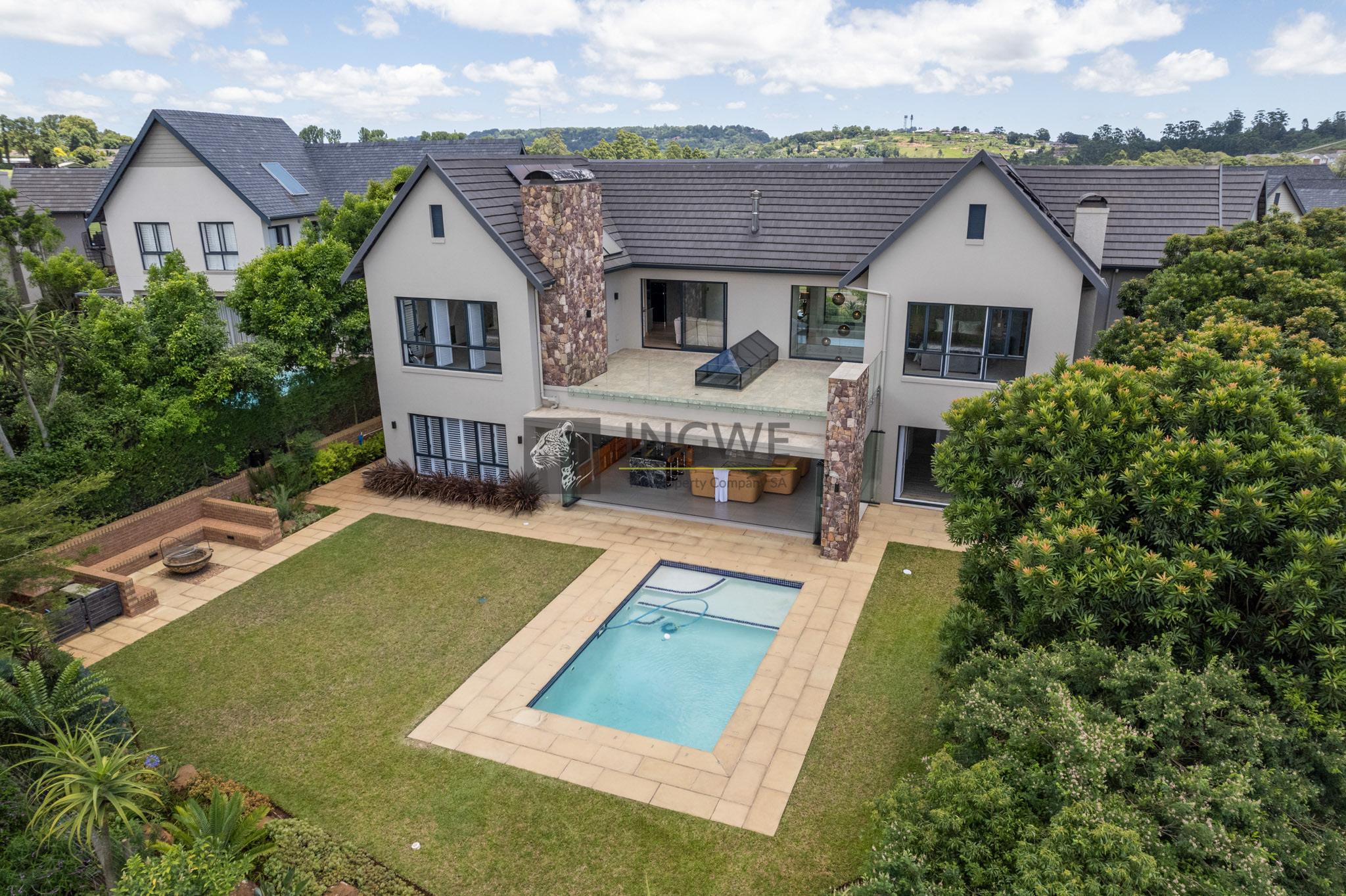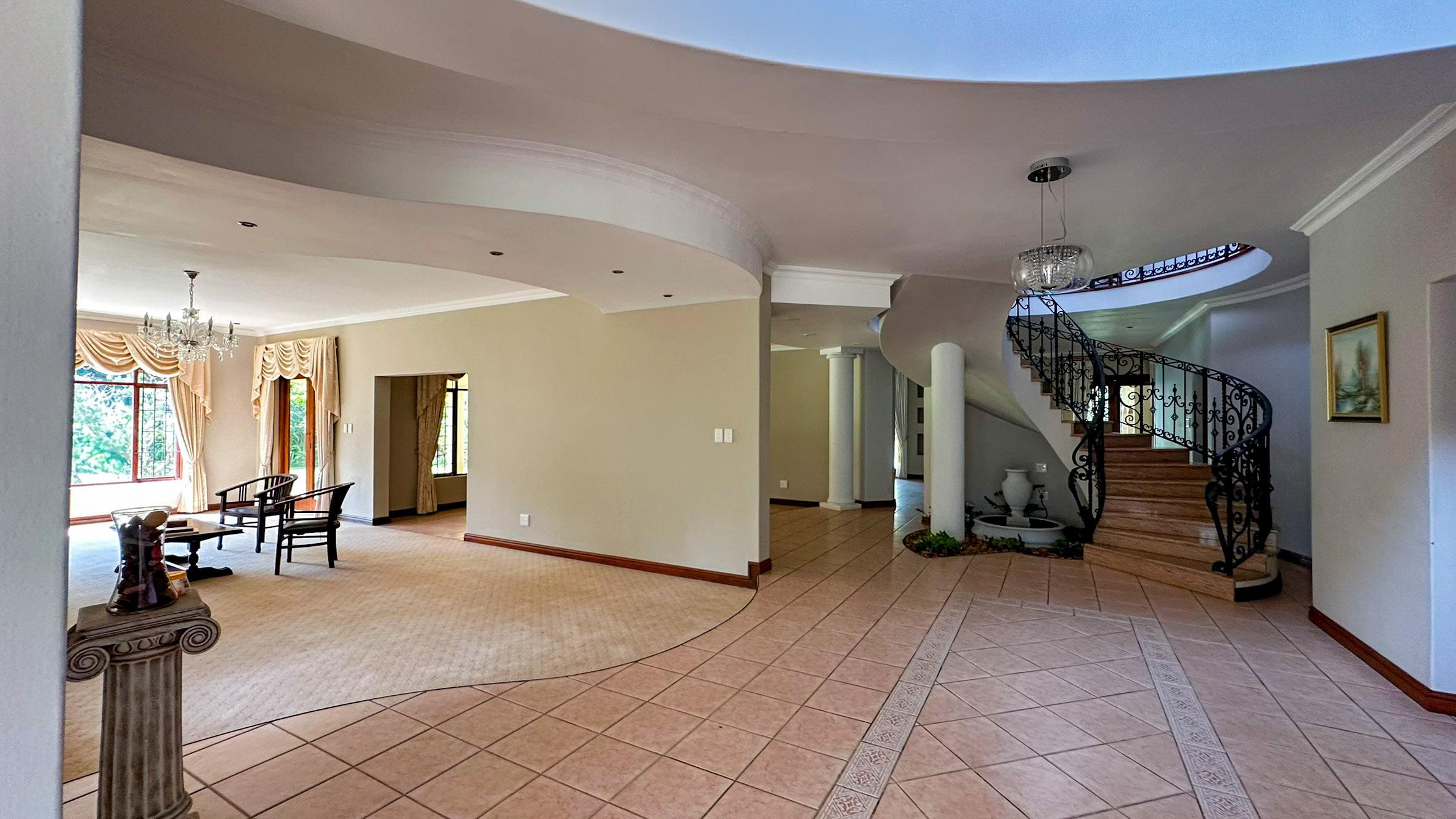 effortless work-from-home living, and multiple leisure spaces and braai area, perfect for hosting family and friends. A sweeping wrought-iron staircase leads to the upper level, where solid Merbau wooden floors and a versatile lounge create opportunities for a pyjama lounge, piano room, or creative retreat. Each of the four bedrooms boasts modern en-suite bathrooms, ensuring comfort and privacy.
