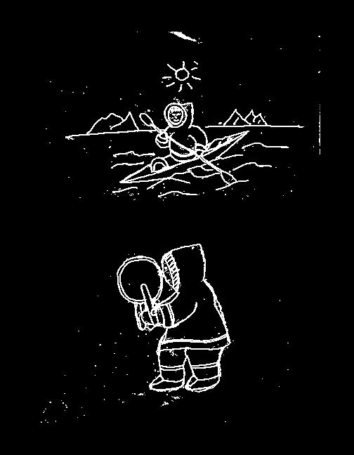 in Inuttitut, are designs that are frequently embroidered on tablecloths and clothing, featuring everyday scenes such as people berrypicking or playing games. The scenes depicted in these drawings were different. Using inukuluks, Aunt Nellie had illustrated memories from her days at the boarding school in Nain.