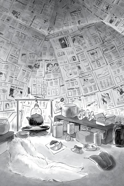 After one of these exercises, we came into the qarmaq, where my mother was rewallpapering and my father was skinning foxes