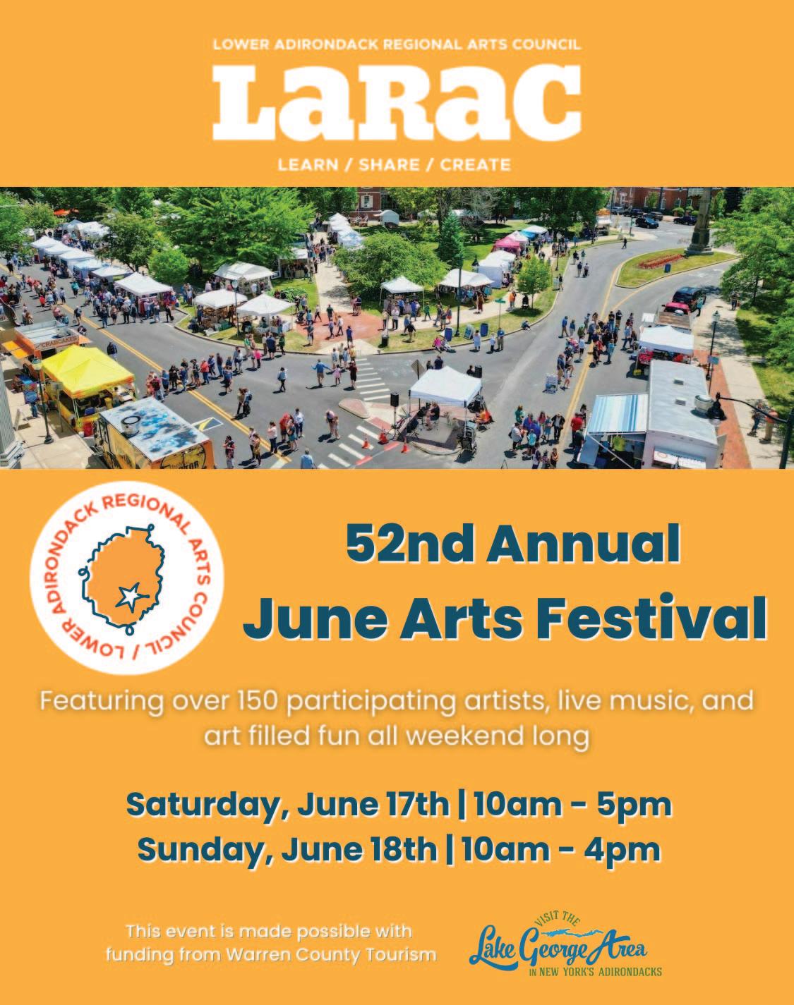 Fes tival. The biggest juried fine arts fes tival in the Adirondack Region is back for its 52nd year! LARAC's An nual June Arts Festival will be hap pening Saturday, June 17th and Sunday, June 18th in Glens Falls City Park. Featuring over 150 artists from around the country, live music, and an array of food and drink options, this festival is fun for the whole family. June 17th, 10am - 5pm / June 18th, 10am - 4pm. This event is rain or shine.