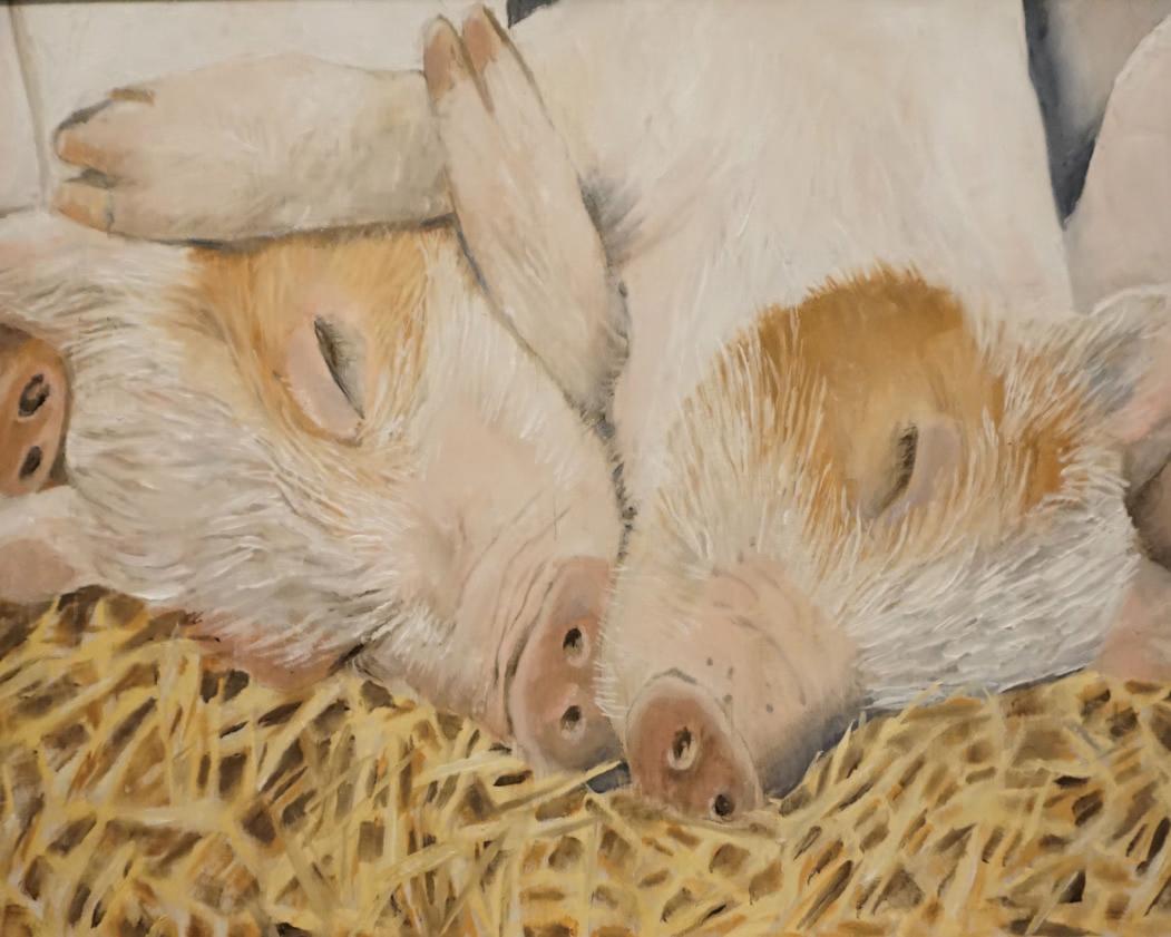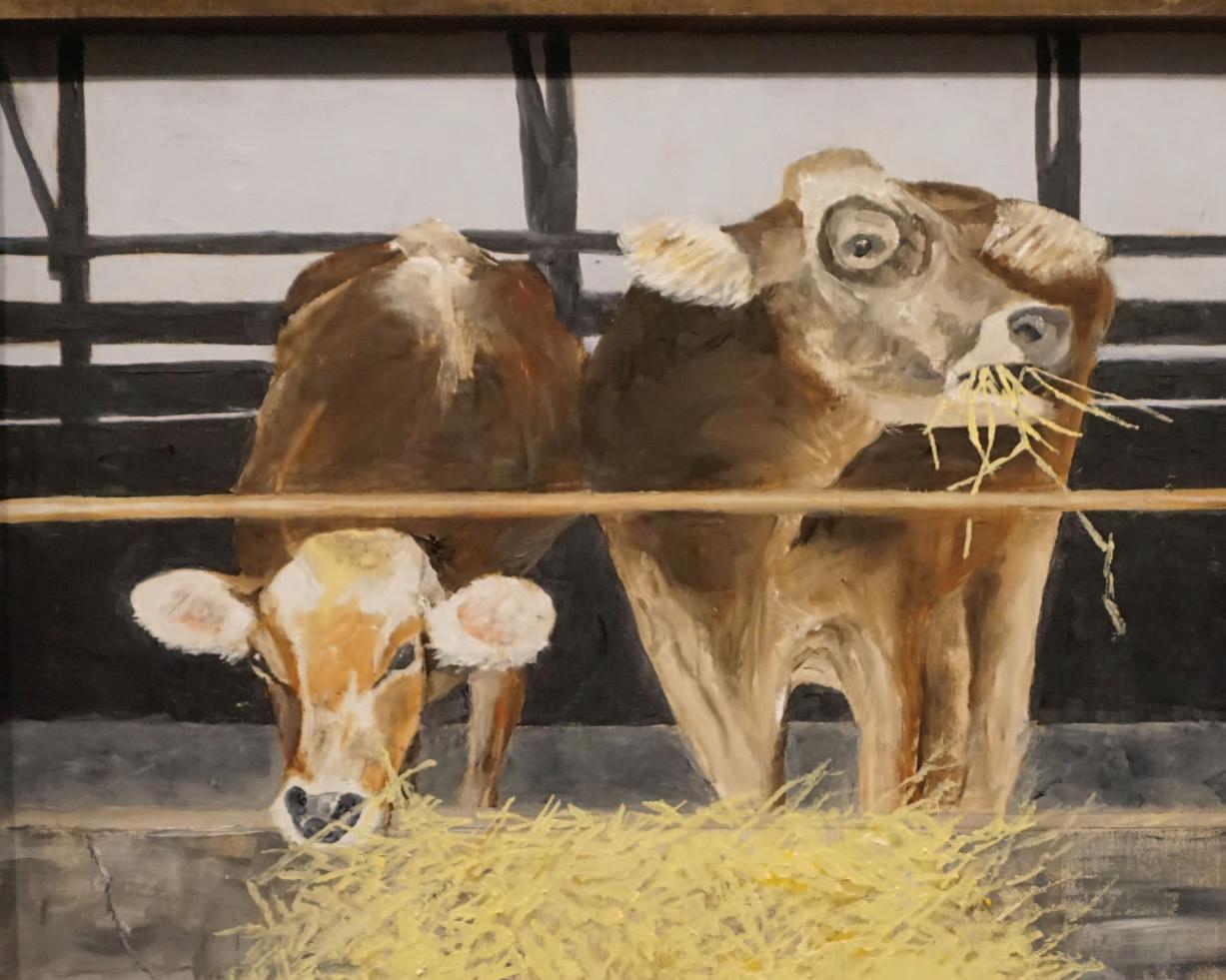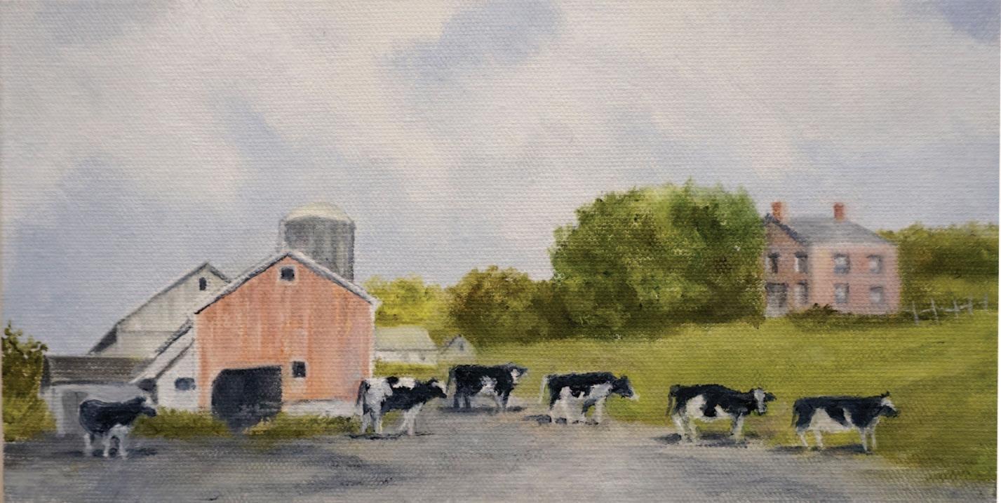 There is also fun on the inside. One six by twelve-inch interior painting depicts a barn in the forefront with a house in the background. A group of cows is crossing the street in a straight line, in the spirit of the cover of the Beatles Abbey Road album. Mark titled the paint “Pedestrian Crossing.” In another interior painting, a group of cows are lying on the ground. She titled this painting “Gossip Girls.”