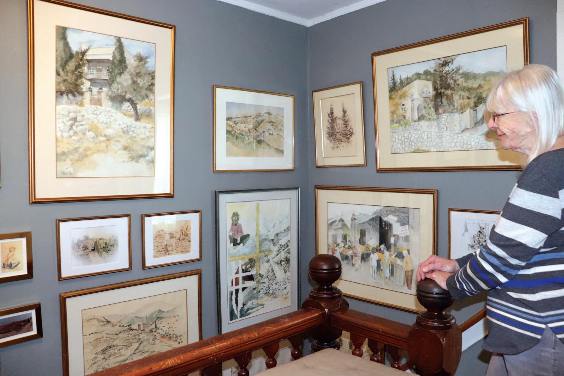 In Israel, the great amount of sun light demands a transparent medium like watercolors. Jerusalem has many small stone buildings with red tile roofs. When the sun hits Jerusalem white stone towards sunset, the stone looks like gold inspiring the Hebrew song “Jerusalem of Gold.” Mark painted these stone houses, even when broken, as she is attached to older items that have a history. She sup plemented her income by selling most of her Israeli art.