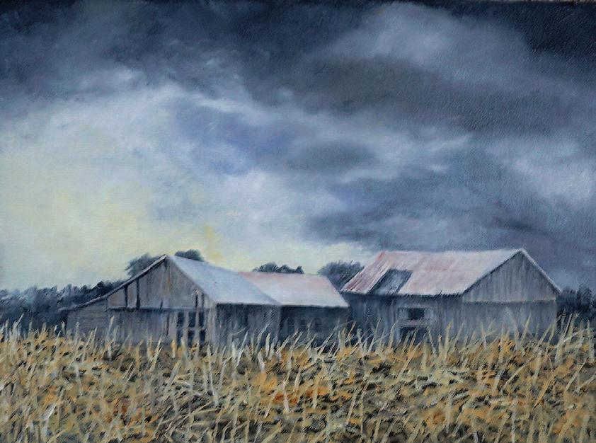 Mark likes to portray the barns in “as is” condition showing their flaws such as loose boards. A lot of the barn paintings are done with dramatic (before wicked storms) skies. Mark has given the barns names such as “Witness” and “Sentinel” as she contemplates all the events that that they would have been able to testify about if human. In a way, she is Dr. Doolittle to these barns.