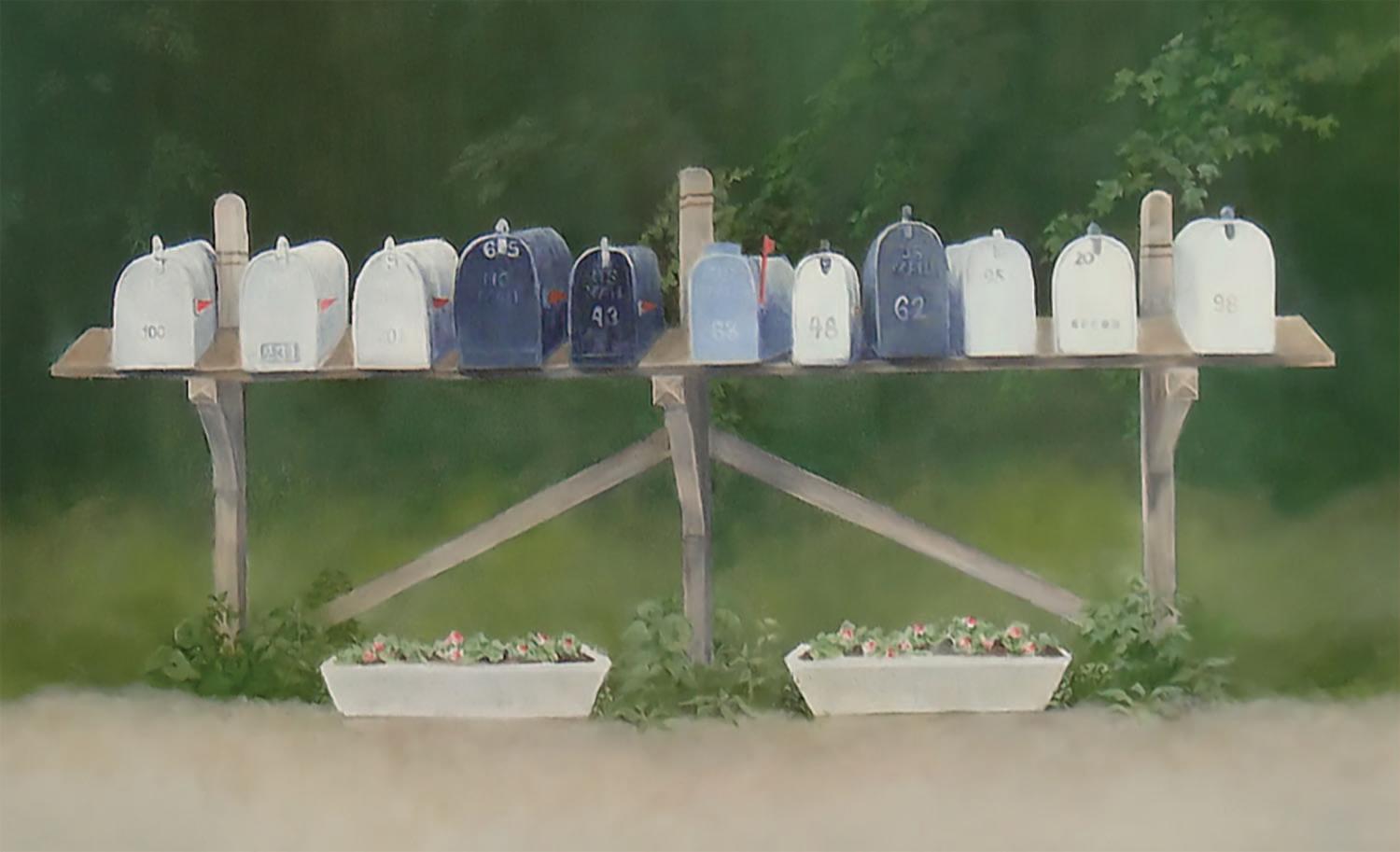 Her style is realistic. For example, the raised letters on a mailbox in one of her paintings are clearly depicted.