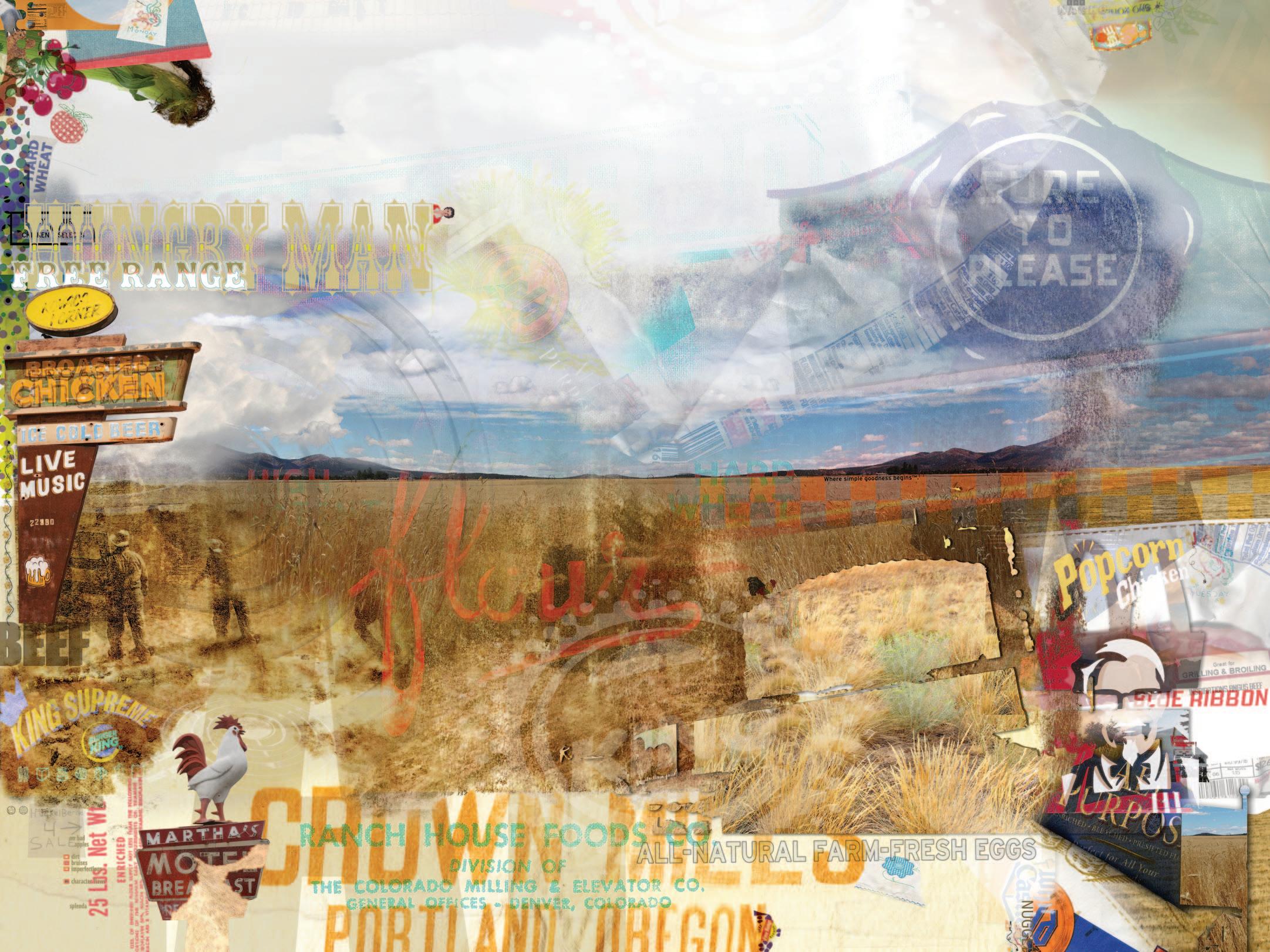 she saw as a tragic loss to the natural habitat she once knew and then with Adobe Illustrator added layers of contrasting images and design type to demonstrate that loss and make a statement.