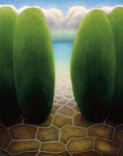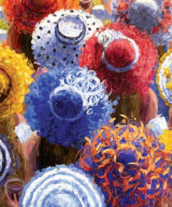 In Home Sweet Home, she depicts the simple beauty of a robin’s nest which is home to delicate eggs that will hatch and be protected until ready to fly away. The nest hangs above the utter chaos of our world littered with scattered ap pliances, TVs, fans, sofas, satellites, smokestacks, and more. It clearly demonstrates the proliferation of the not-sosweet parts of our ‘home sweet home,’ and the impact they have on nature and our environment.
