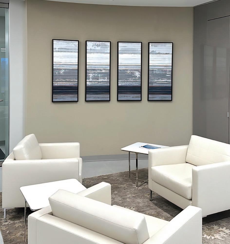 Without a doubt, Myott is en gaging and exuberant when speaking of his art, but serious professionalism underscores the projects he’s working on, especially commissions. At the outset, he spends a great deal of time building a trusting rela tionship by getting to know his clients, their goals, and preferences. He even sends them pictures throughout the creative process, showing him stretching canvas, mixing the palettes, and actually painting.