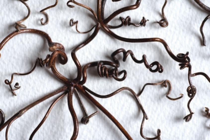 a number of compositions, framed them, and showed them as well. They were wellreceived. But early on after one of the shows, he found flecks of dirt and debris that had dropped to the bottom from the tendrils inside the frames of his completed pieces. Thankfully he quickly discovered that one coat of shel lac would prevent flaking and pre serve the tendril shape which now allows him to amass hundreds, if not thousands of tendrils, ready to take their place in an upcoming piece.