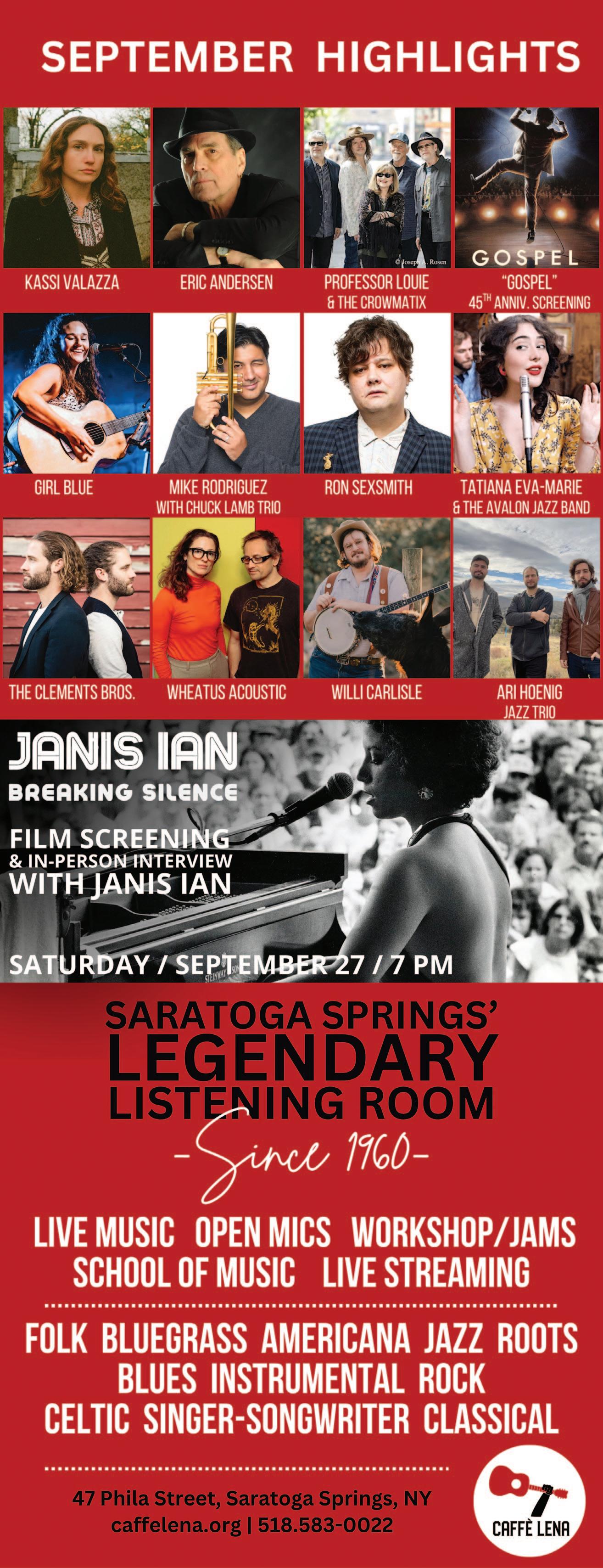 Willi Carlisle with Special Guest Cat Clyde. Join us for an unforgettable evening with acclaimed folksinger Willi Carlisle as he graces the stage at Caffè Lena. Known for his evocative storytelling and dy namic performances, Carlisle brings a fresh perspective to traditional folk music, weaving tales that resonate with authenticity and heartfelt emotion. Saturday, September 20. Time 8:00 pm – 10:00 pm. Doors Open: 7:30 pm. Caffè Lena, 47 Phila Street, Saratoga Springs, NY 12866