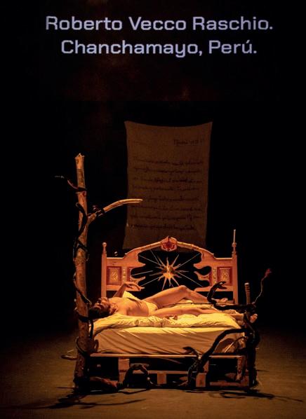 Este libro de dos caras, este NIGHTDREAM y este DAYDREAM que tienes entre manos representa la tercera pieza que surge a partir de nuestro anti-archivo (de nuestra acción recopilatoria). La primera, es una instalación viva que fue exhibida en la Sala Amadís, Madrid, España en septiembre de 2021. La segunda, una pieza escénica representada en la sala Juan de la Cruz del Teatro de La Abadía, en octubre de ese mismo año y en la misma ciudad. Y aunque este texto no pretende ser un fantasma de lo que fueron estos dos trabajos anteriores, sí que intenta registrarlos para construir una especie de arca dentro del propio anti-archivo, nuestro deseo es documentar en estas páginas lo que «no se impone desde el exterior sino [que] emerge del archivo mismo» (...)3 . Así que es posible que tengamos que requerir algo de ti, es posible que tengamos que pedirte que apeles a tu imaginación para poder ver la habitación oscura y dilatada de la sala de museo, rodeada de objetos que de alguna manera lograron atravesar la membrana que existe entre el sueño y la vigilia, con una cama central custodiada por un tunche4; para poder contemplar las bombillas oscilando en gamas de color, intentado replicar el sueño inexpresable de Pablo; para poder oír las voces de las personas soñantes resonando en las paredes de iglesia de la sala Juan de la Cruz, mientras Danielle, Malvin e Iriana danzan girando sobre sí mismas; para poder sentir la música de Sammy y Luca resonando en los oídos de la audiencia nocturna de la Sala Amadís; para poder sentir el calor de las llamas de los candelabros que encendemos para alejar las amenazas con el brillo del fuego; para poder observar el paisaje que nace en los ojos humedecidos de Rosa Meza Zorrilla, mientras le cuenta a su nieta en quechua la historia de su funeral… pero intentaremos hacerlo fácil, intentaremos con todas nuestras fuerzas que estos caracteres se conviertan en imagen, sonido y textura, intentaremos que estas palabras, y en lo que sea que logremos transformarlas, bailen en tu inconsciente para que así, quizás, puedas vivirlo en tus propios sueños, en tu propio ritual cotidiano de muerte y resurrección.
