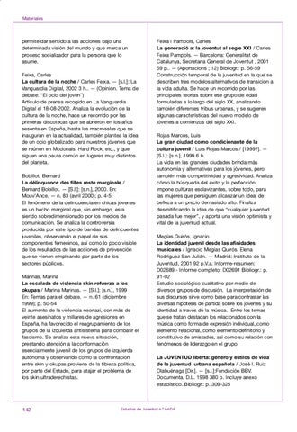 permite dar sentido a las acciones bajo una determinada visión del mundo y que marca un proceso socializador para la persona que lo asume. Feixa, Carles La cultura de la noche / Carles Feixa. — [s.l.]: La Vanguardia Digital, 2002 3 h.. — (Opinión. Tema de debate: “El ocio del joven”) Artículo de prensa recogido en La Vanguardia Digital el 18-08-2002. Analiza la evolución de la cultura de la noche, hace un recorrido por las primeras discotecas que se abrieron en los años sesenta en España, hasta las macrosalas que se inauguran en la actualidad, también plantea la idea de un ocio globalizado para nuestros jóvenes que se reúnen en Mcdonals, Hard Rock, etc., y que siguen una pauta común en lugares muy distintos del planeta. Bobillot, Bernard La délinquance des filles reste marginale / Bernard Bobillot. — [S.l.]: [s.n.], 2000. En: Mouv’Ance. — n. 83 (avril 2000); p. 4-5 El fenómeno de la delincuencia en chicas jóvenes es un hecho marginal que, sin embargo, esta siendo sobredimensionado por los medios de comunicación. Se analiza la controversia producida por este tipo de bandas de delincuentes juveniles, observando el papel de sus componentes femeninos, así como lo poco visible de los resultados de las acciones de prevención que se vienen empleando por parte de los sectores públicos. Marinas, Marina La escalada de violencia skin refuerza a los okupas / Marina Marinas. — [S.l.]: [s.n.], 1999 En: Temas para el debate. — n. 61 (diciembre 1999); p. 50-54 El aumento de la violencia neonazi, con más de veinte asesinatos y millares de agresiones en España, ha favorecido el reagrupamiento de los grupos de la izquierda antisistema para combatir el fascismo. Se analiza esta nueva situación, prestando atención a la conformación esencialmente juvenil de los grupos de izquierda autónoma y observando como la confrontación entre skin y okupas proviene de la tibieza política, por parte del Estado, para atajar el problema de los skin ultraderechistas.