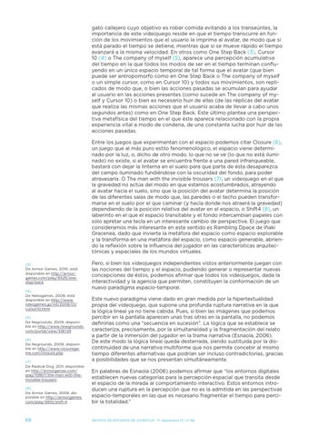 gato callejero cuyo objetivo es robar comida evitando a los transeúntes, la importancia de este videojuego reside en que el tiempo transcurre en función de los movimientos que el usuario le imprima al avatar, de modo que si está parado el tiempo se detiene, mientras que si se mueve rápido el tiempo avanzará a la misma velocidad. En otros como One Step Back (3), Cursor 10 (4) o The company of myself (5), aparece una percepción acumulativa del tiempo en la que todos los modos de ser en el tiempo terminan confluyendo en un único espacio temporal de tal forma que el avatar (que bien puede ser antropomorfo como en One Step Back o The company of myself o un simple cursor, como en Cursor 10) y todos sus movimientos, son replicados de modo que, o bien las acciones pasadas se acumulan para ayudar al usuario en las acciones presentes (como sucede en The company of myself y Cursor 10) o bien es necesario huir de ellas (de las réplicas del avatar que realiza las mismas acciones que el usuario acaba de llevar a cabo unos segundos antes) como en One Step Back. Este último plantea una perspectiva metafísica del tiempo en el que éste aparece relacionado con la propia experiencia vital a modo de condena, de una constante lucha por huir de las acciones pasadas. Entre los juegos que experimentan con el espacio podemos citar Closure (6), un juego que al más puro estilo fenomenológico, el espacio viene determinado por la luz, o, dicho de otro modo, lo que no se ve (lo que no está iluminado) no existe, si el avatar se encuentra frente a una pared infranqueable, bastará con dejar la linterna en el suelo para que parte de ésta desaparezca del campo iluminado fundiéndose con la oscuridad del fondo, para poder atravesarla. O The man with the invisible trousers (7), un videojuego en el que la gravedad no actúa del modo en que estamos acostumbrados, atrayendo al avatar hacia el suelo, sino que la posición del avatar determina la posición de las diferentes salas de modo que, las paredes o el techo pueden transformarse en el suelo por el que caminar (y hacia donde nos atraerá la gravedad) dependiendo de la posición relativa del avatar en el espacio, o Shift4 (8), un laberinto en el que el espacio transitable y el fondo intercambian papeles con sólo apretar una tecla en un interesante cambio de perspectiva. El juego que consideramos más interesante en este sentido es Rambling Dpace de Iñaki Gracenea, dado que invierte la metáfora del espacio como espacio explorable y la transforma en una metáfora del espacio, como espacio generable, abriendo la reflexión sobre la influencia del jugador en las características arquitectónicas y espaciales de los mundos virtuales. (3) De Armor Games, 2010, está disponible en http://armorgames.com/play/6525/onestep-back (4) De Nekogames, 2008, está disponible en http://www. nekogames.jp/mt/2008/01/ cursor10.html (5) De Negrounds, 2009, disponible en http://www.newgrounds. com/portal/view/518729 (6) De Negrounds, 2009, disponible en http://www.closuregame.com/closure.php (7) De Radical Dog, 2011, disponible en http://armorgames.com/ play/10807/the-man-with-theinvisible-trousers