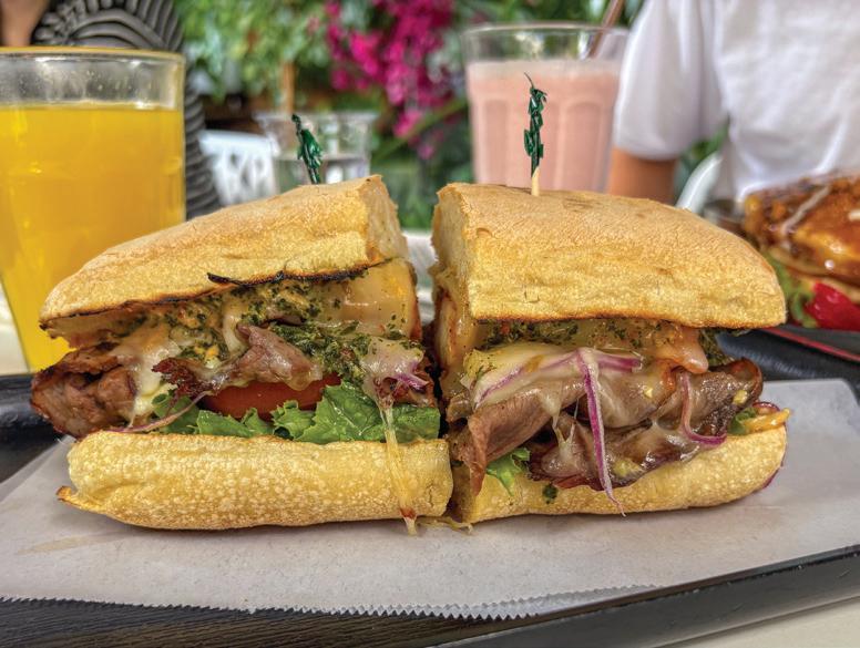 This Chimichurri sandwich is full of herb flavoring and is packed with tender homecooked tri-tip. On top of that, the addition of jumbo shrimp creates a surf and turf sandwich unlike any other. The chimichurri sauce seeps into the tri-tip, giving each bite a garlicky taste with a kick of spice. Alongside the juicy steak, the jumbo shrimp with its salty and ocean-like taste creates a contrast of flavor to complete this surf and turf sandwich. Topping off the meats, fresh produce like lettuce and tomato adds a final satisfying touch to each bite. Finally, served on a signature handmade ciabatta bread, the sandwich strikes a balance between texture and flavor, with the bread acting as a foundation for this delicious sandwich.