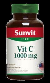 Siestáenperiododeembarazo,lactanciaosipiensarealizaralgúnprocedimientomédicoconsulteasudoctorantesdeusar. Nosuperarladosisdiariarecomendada. SUNVIT VIT C 1000 MG (RS: DE-2664): Si está en periodo de embarazo, lactancia, tomando medicamentos, o si piensa realizar algún procedimiento médico consulte a su doctor antes de usar. Suspenda su uso y consulte a su médico si alguna reacción adversa ocurriera. No superar la dosis recomendada. En algunos casos dosis altas puedenw causar diarrea o alterar algunas pruebas de laboratorio. Precaución en pacientes con osteoartritis, diabéticos y embarazadas. No se deben ingerir grandes cantidades en conjunto con medicamentos que contengan aluminio. Lleva 3 cajas a : Lleva 2 a 49.90** S/ 34.90S/ Sunvit blisters Caja de 15 cap. Productos seleccionados*** Lleva 2 cajas a : 90.00** Nat B Cápsulas blandas Caja de 30 unid. S/ Lleva 1 a 49.90S/ Sunvit L- Arginine 1000 Frasco de 60 tab.