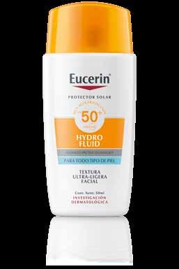 *Resultados observados según estudio de producto en uso, Beiersdorf A.G. **Libre de microplásticos de acuerdo a la definición de la UNEP. ADVERTENCIAS Y PRECAUCIONES: EUCERIN HYDRO FLUID (NSCOC17861-22CO): Mantener alejado del alcance de los niños. Este producto no ofrece ninguna protección contra la insolación. Este producto no está formulado para su uso en niños y no constituye una protección al 100%. No usar en menores de 6 meses.No permanezca demasiado tiempo al sol, aunque utilice un producto de protección solar.