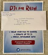 On Friday, November 18th, elementary schoolers celebrated PJs for Riley by wearing their favorite pajamas to school and by bringing in a donation of up to $1. Leading up to PJ Day, we provided information about Riley Children’s Hospital, why it is important to our community, and how together we can make a big impact while also having fun. The goal of our project was and has always been to help people at Riley Children's Hospital, and we are excited that this coincided with the opportunity to learn about service, leadership, and love for their community!