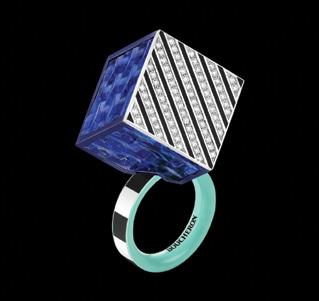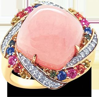 its exquisite pink opal, sapphire and diamond ring masterfully set in 9ct yellow gold. It is just one of many designs featured in Gerrim’s latest catalogue to be released at the fair. Stand 50