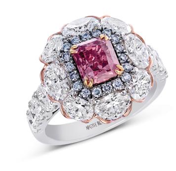 The heart of this piece is an extremely rare 1.36 carat, Fancy Deep Pink radiant cut diamond. It is just one of 12 radiant cut diamonds over one carat with a colour grading, 1P, from the last 30 years of production from Argyle. The surrounding petaled design of pink and blue Argyle Diamonds™ totals 1.89 carats, together with 2.80 carats of white diamonds. The Argyle Rose TM can be worn as a ring or statement pendant and is available for sale for A$2 million.