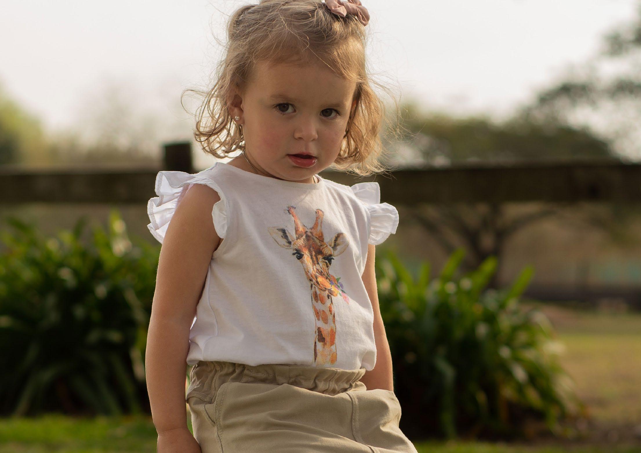 verano Remera Precio Tela Punto jersey de algodón peinado 24 /1 con volados en voile de algodón y estampa Jirafa Blanco con estampa $1.450 Talles 2 4 6 8 10