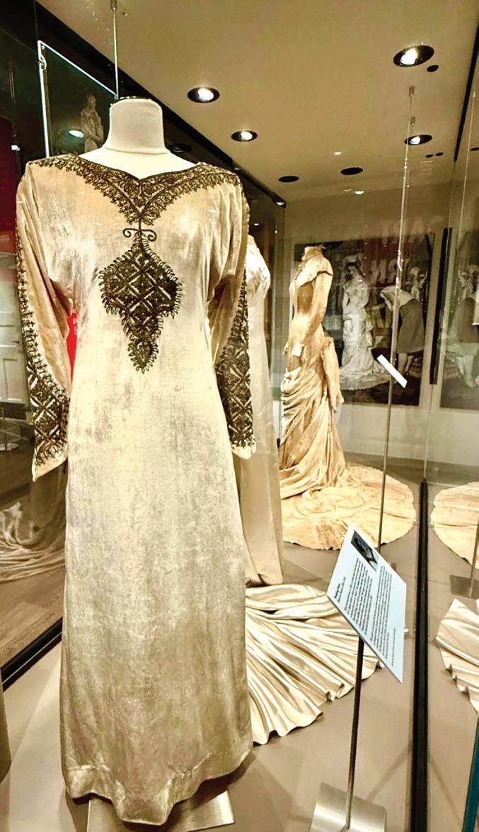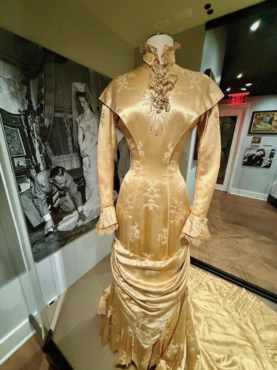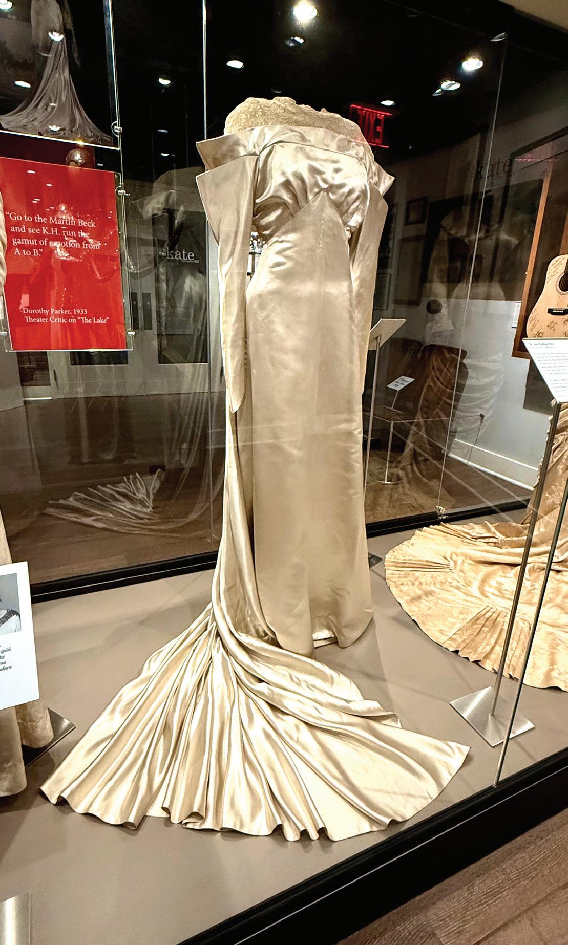 Here’s something you absolutely do not want to miss, “Here Comes the Bride.” On display right now until the middle of November is a very special museum acquisition. It’s Katharine’s wedding dress, the one she chose to wear in 1928 when she married Ludlow Ogden Smith. They were married in a simple ceremony in her parents’ living room in Hartford, the officiant being her grandfather, Reverend Sewell Hepburn. The dress came from Babani, a Parisian fashion house, and its style was described as “quintessential Kate.” Unlike the wedding gowns of the period, this was a tea dress: simple, comfortable, yet it bore intricate detailing. It is fashioned from silk velvet and metallic embroidery freeing and delighting Katharine from having to wear a corset and offering her great comfort much like the wide-leg trousers she frequently sported. Within the same exhibit is a dress worn in a short-lived Broadway play, “The Lake” and another from the 1947 film, “The Sea of Grass.”