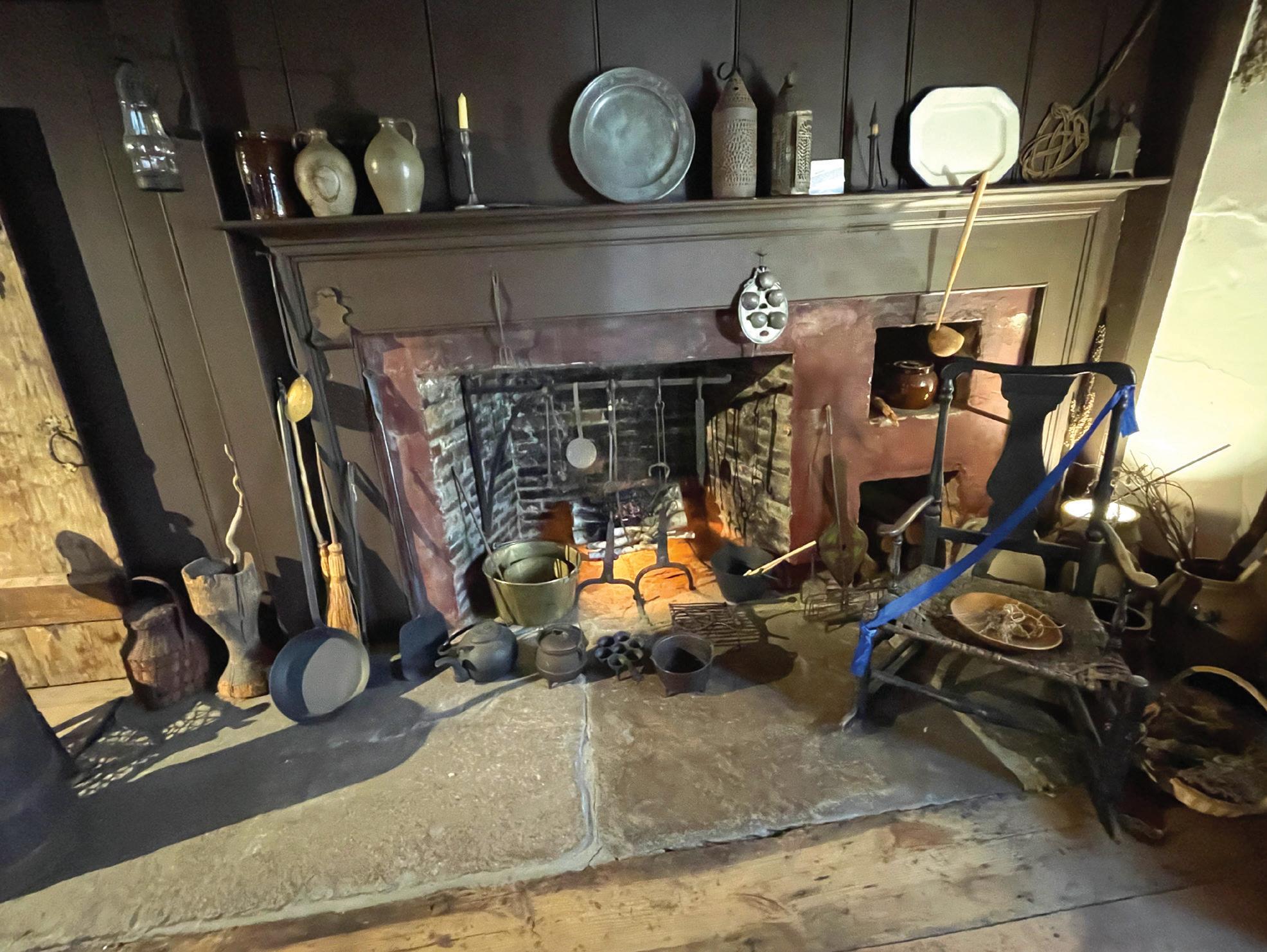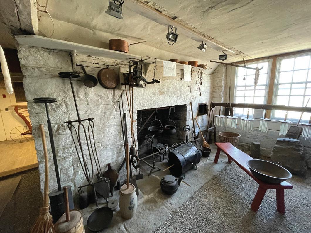 The summer kitchen—a separate cooking space designed to keep heat and smoke out of the main living areas during warm months. Equipped with a hand-cranked spit mechanism, it showcases colonial-era ingenuity in household management.