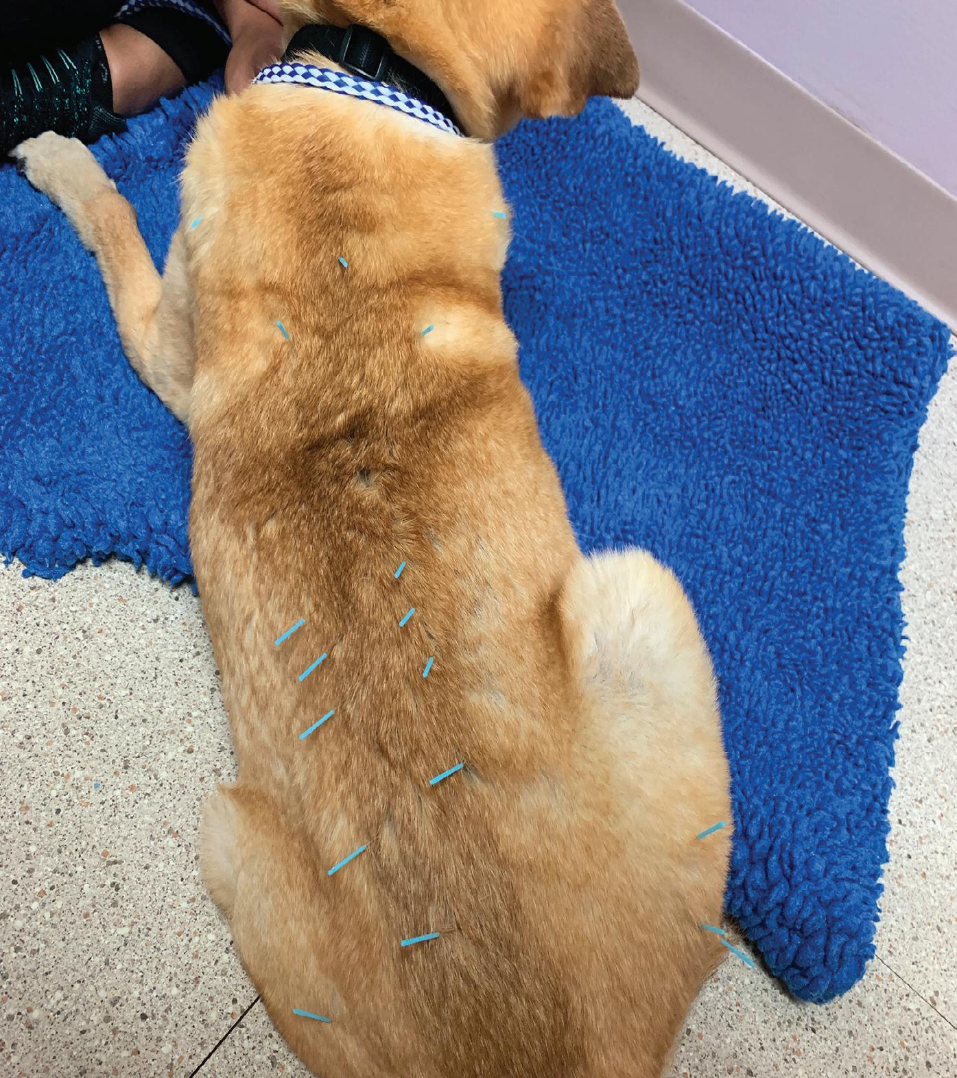 Her first patient is Pepper, an 18-year-old male with back issues. He stands quietly after small needles (which are not painful) are inserted on his back for 30 minutes.