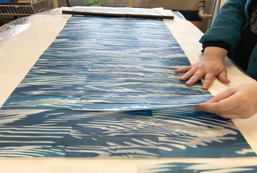 With years of study in Eastern disciplines and an immersive practice of Zen Yoga, Qi Gong and Tai Chi, her artistic output is an imprint of her relationship with nature. Flip through each of her blue pages...riffl e through one of her impossible rushes of waterfalls and it is a moment. The space is fi lled with shapes describing movement: blue coils and helixes; softly stacked pages inviting a touch. View it again as the light shifts and it changes from that moment ago. It’s stated that,