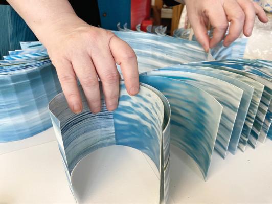 Lasting first impressions of Barbara Hocker’s work cycle back to Real Art Ways (RAW) 2019. Sea & Sky Library is a vivid experience – an accordioned mixed-media ocean, spanning the gallery floor, with pools of people forming around her work. Transfixing and experiential –her memory of water is made into an artform...an indoor ocean you dive into. There is a kinetic component woven into these blue waves. Shift your position and a subtle element grabs the light. You’d swear the tides moving! Hocker’s work is a meticulous exercise with duality and contradictions in nature; it deviates from traditional bookmaking despite the reference to over leaves and