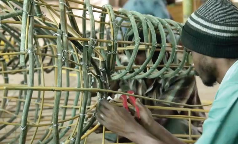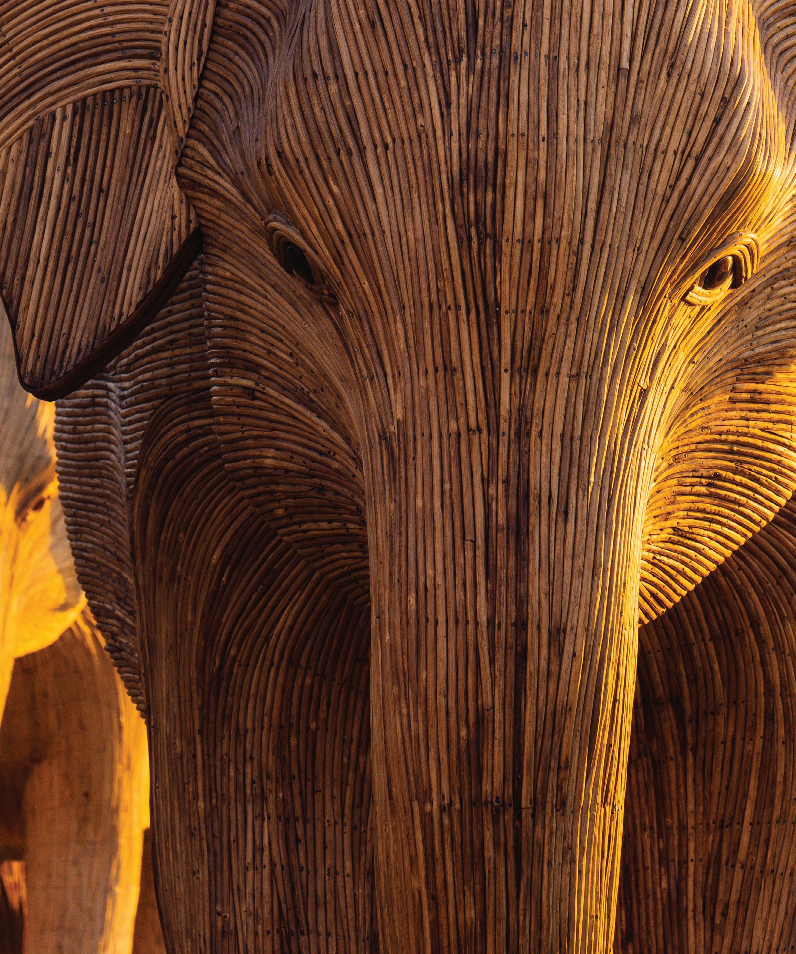 Each elephant, from the largest to the smallest, is fastidiously crafted using dried lantana camara. It is then wrapped in 1/2-inch strips around a steel re-bar frame and coated with Osmo Oil for protection. Osmo oils contain natural vegetable oils to nourish and protect wood, maintaining a natural look. Lantana camera is a highly adaptable flowering plant. Once introduced into a habitat, it quickly spreads. It's considered one of the world's top invasive weeds. It has taken over 300,000 square kilometers of India's forests, impacting the food sources for herbivores, affecting the tiger reserves, and pushing the gentle giants into human areas.