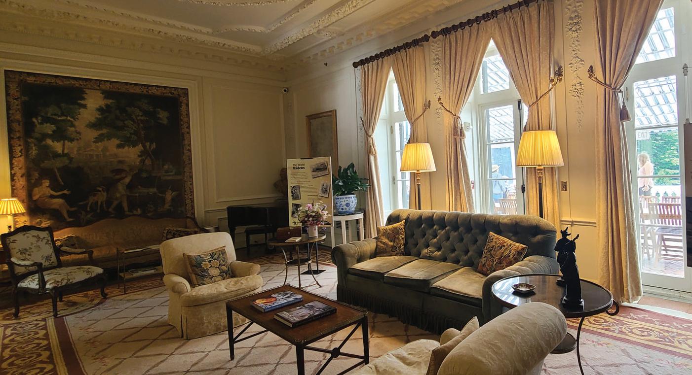 The restored gardens include an Italian walled garden, an alpine rock garden, and a tree-lined limestone path to the formal garden. All are handsome and have seating for contemplation. The wooded trails are carefully curated with periwinkle ground cover, ferns and grassy knolls creating a mystical atmosphere.