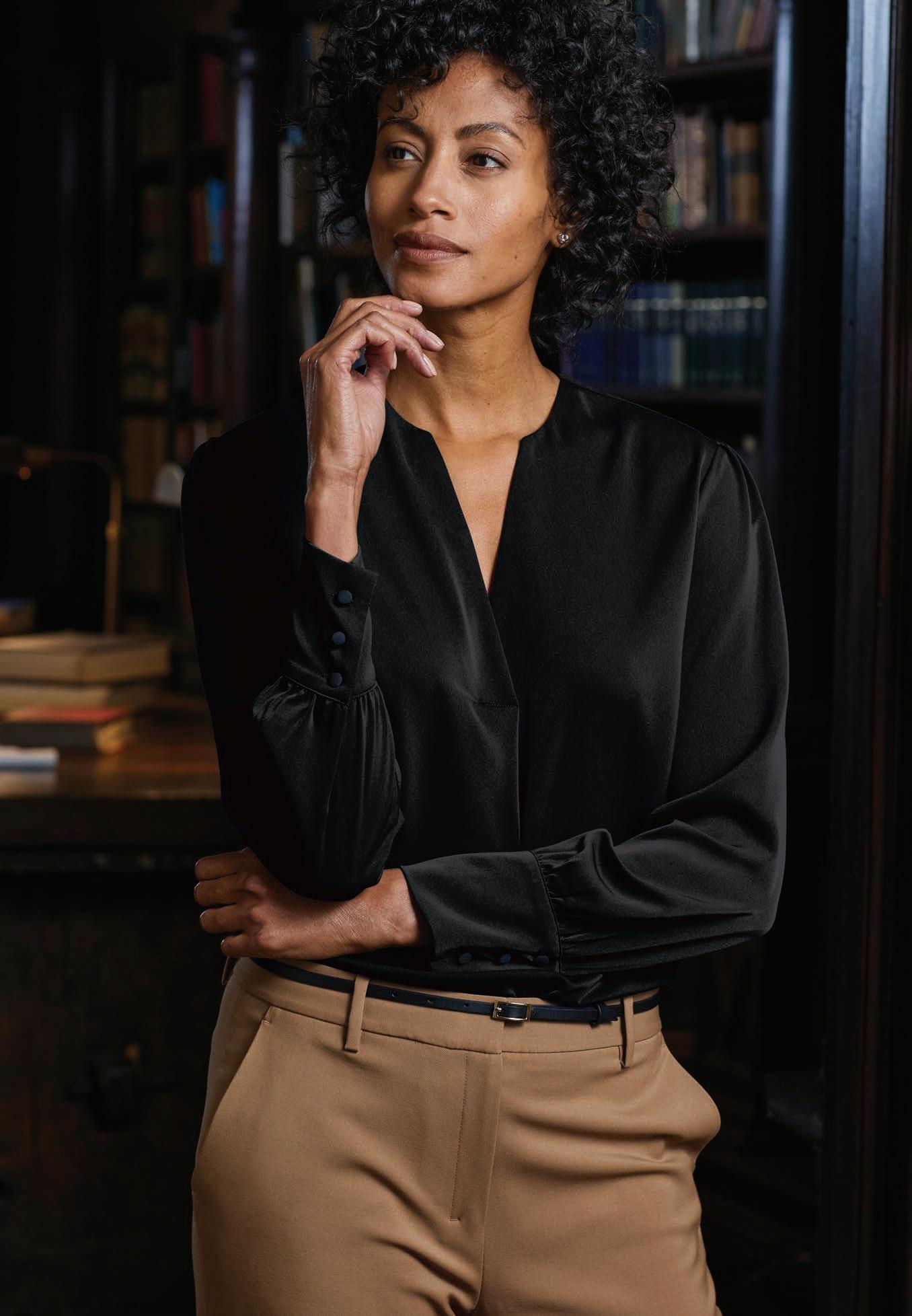 Soft satin with a matte feel lends an easy, elegant touch to your wardrobe.