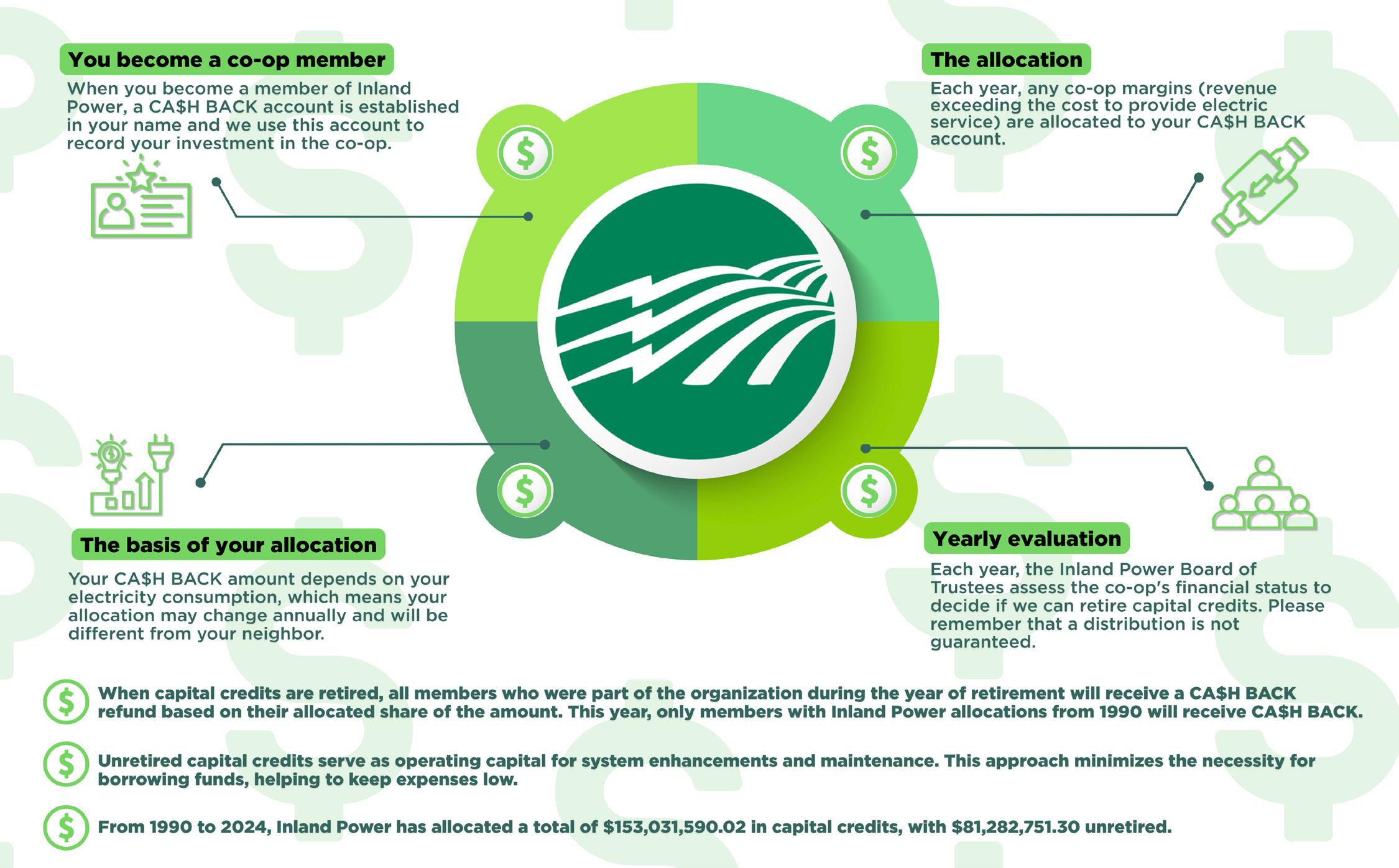 As an owner-member of Inland Power, a notfor-profit cooperative, our primary mission is to deliver safe and dependable power at cost. Any revenue that exceeds the cost of providing power is either reinvested into the cooperative’s assets or returned to you through our CA$H BACK program, also known as capital credits.