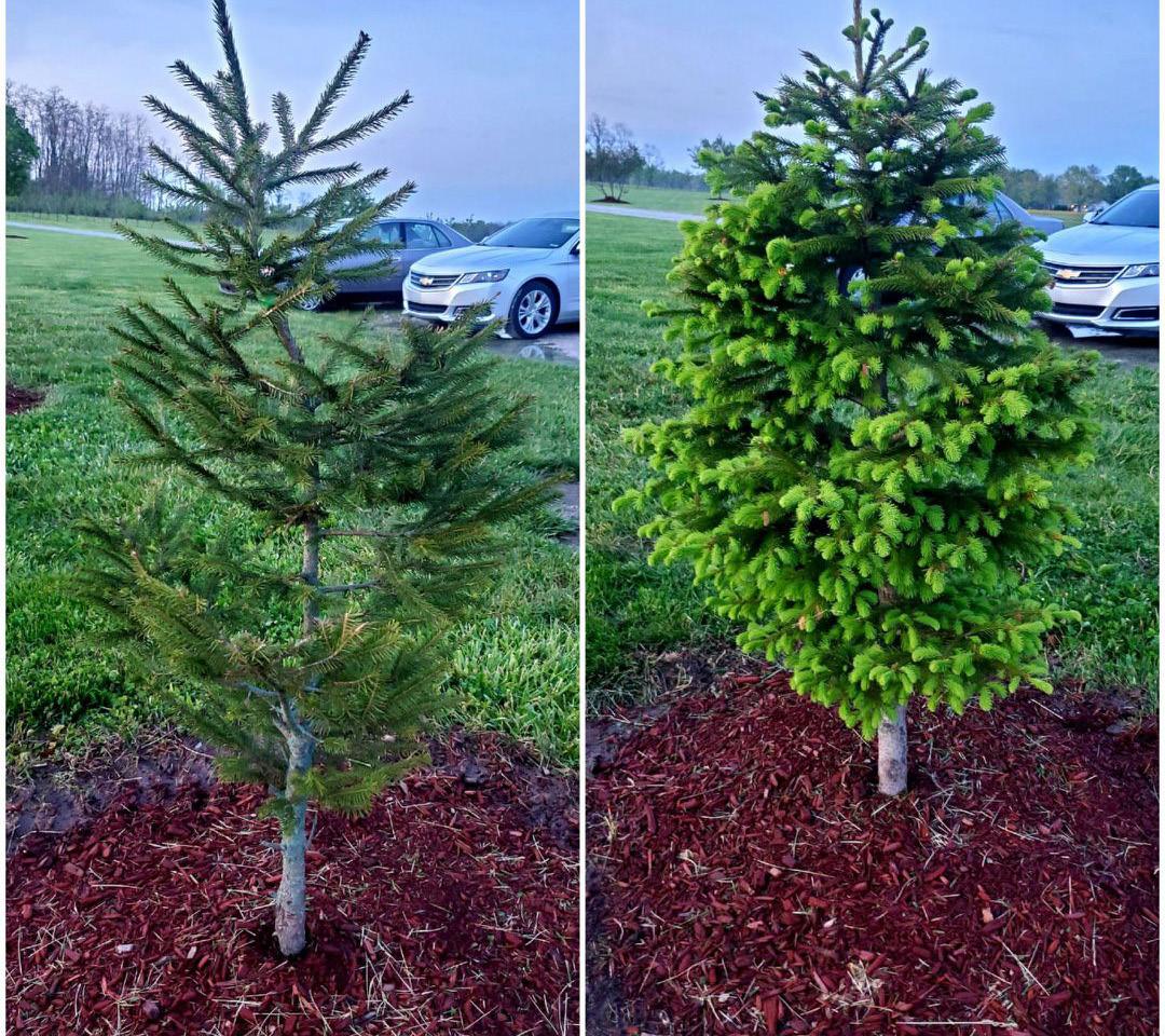 •Remove approximately ½ of newly expanding candle (new shoot growth on each branch). Christmas tree growers shear trees each June to increase bud count and density. In landscape situations, prune only every 2-3 years.
