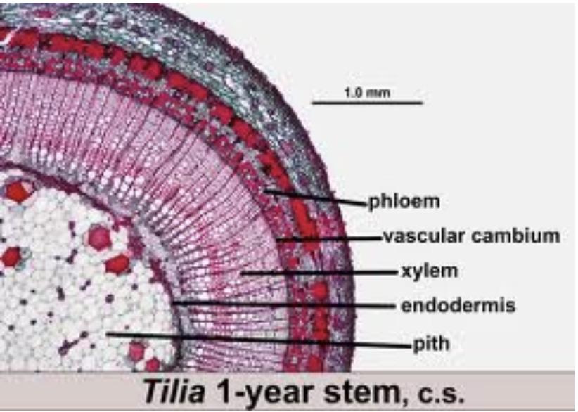 Cambium = meristematic cells between xylem & phloem, just below surface of dicot stem. This is the region where increase in trunk caliper occurs