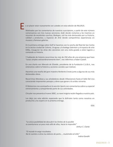 s un placer estar nuevamente con ustedes en esta edición de INLUXUS. Motivados por los comentarios de nuestros suscriptores, a partir de este número comenzamos con tres nuevas secciones; Golf, donde visitamos y les traemos un resumen de excelentes canchas; Bodegas, con las más destacadas por su historia, calidad y productos; y Espacios de Arte donde compartimos experiencias en museos y famosas galerías. En la primera entrega sobre Golf lo hacemos con la cancha del Real de San Carlos en la vecina ciudad de Colonia, Uruguay y la bodega Salentein y el espacio de arte Killka, inauguran las otras dos secciones con una visita guiada a estos lugares y contando su historia. Y hablando de historia recorrimos los más de 250 años de una empresa que hace “cosas simples extraordinariamente bien”, nos referimos a Faber-Castell. En una charla con Marcelo de Elizalde, presidente de la Fundación C.U.B.A., nos enteramos sobre la historia y acciones sociales que realizan. Hacemos una reseña del gran maestro Norberto Cresta junto a algunas de sus más destacadas obras. Recorrimos Mendoza y sus alrededores desde Villavicencio hasta el Valle Del Uco conociendo imponentes paisajes y obras que ganan a la aridez reinante. El Motocross nos acompaña en la sección Sports con comentarios sobre su especial entrenamiento y compartiendo parte de sus actividades. Chrysler nos presenta al nuevo 300C, su nave insignia recién llegada a nuestro país. Los dejo con esta edición esperando que lo disfruten tanto como nosotros en producirla y los espero en la próxima entrega. EDG