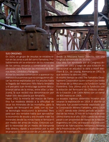 SUS ORIGENES En 1624, un grupo de Jesuitas se establecieron en las zonas a pié del cerro Famatina. Probablemente ahí se enteraron de los minerales de los cerros cercanos y comenzaran su explotación para financiar las misiones de Buenos Aires, Córdoba y Paraguay. Al irse los Jesuitas comenzaron a aparecer numerosos buscaminas que no consiguieron ubicar las minas explotadas por los jesuitas hasta la llegada del mexicano Félix María Amarello y el peruano Juan Arreluciaga quienes descubrieron varias de la minas, entre ellas La Mejicana, la que recibió esa denominación por haber sido descubierta por Amarello. Hasta 1902 la minería del macizo de Famatina fue modesta debido a la dificultad de sacar los minerales de las montañas, pero la llegada del ferrocarril en 1899, con su nueva tecnología revolucionó la actividad. Pero para que sea rentable había que aprovechar la economía de escala y era inviable traer los minerales desde las minas hasta el ferrocarril por medio del arreo de mulas. Entonces surgió la necesidad de un medio de transporte más directo, rápido y económico por lo que se propuso la construcción de un Cable Aéreo 94 - INLUXUS