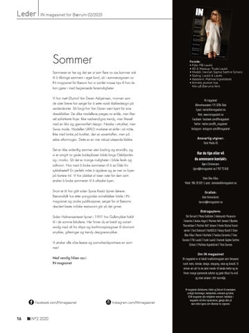 IN magasinet Ullernchausseen 119, 0284 Oslo Epost: kontor@inmagasinet.no Web: www.inmagasinet.no Facebook: facebook.com/INmagasinet Twitter: twitter.com/IN_magasinet Instagram: instagram.com/INmagasinet Ansvarlig utgiver: Total Media AS