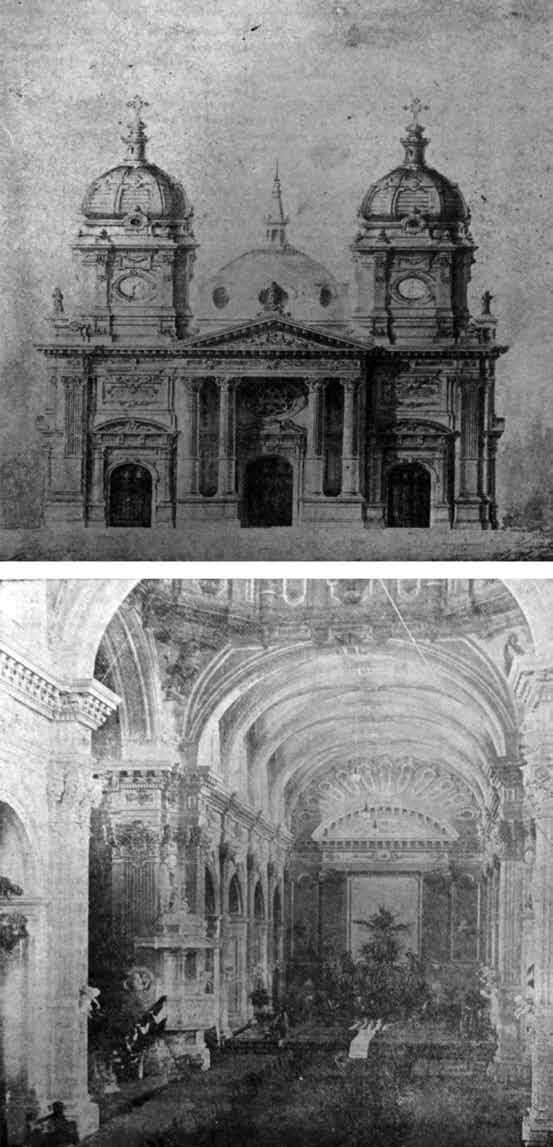 El templo era un edificio elegante, de altas y perfiladas torres de cuarenta y tres metros de alto, las cuales eran visibles desde varios kilómetros para los que se acercaban al pueblo. El ancho era de diez y siete metros. El ábside era de diez metros de largo y el vestíbulo, entre las dos torres, tenía siete metros desde el frente del muro delantero.
