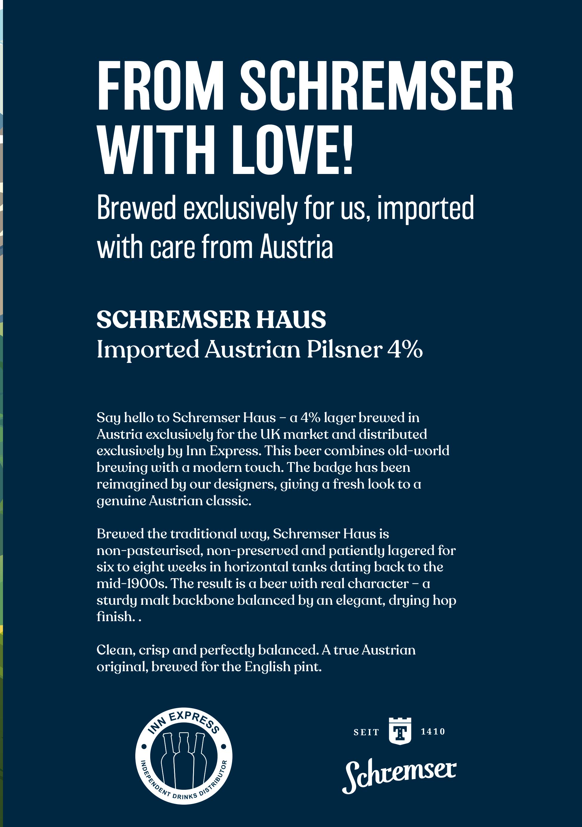 88 FROM SCHREMSER WITH LOVE Brewed for us, imported from Austria.