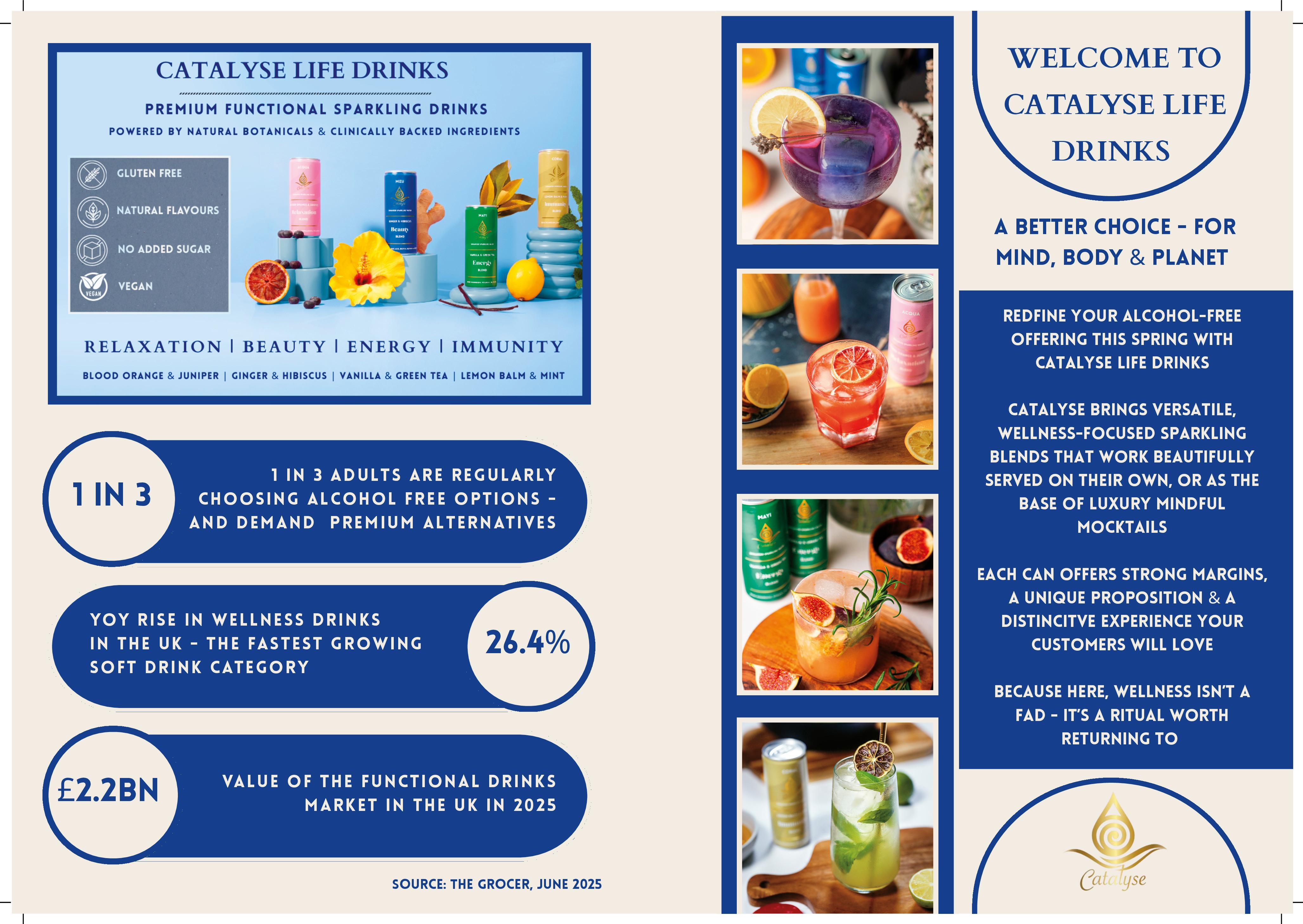 Catalyse Life Enhanced Sparkling Waters delivers a range of premium functional sparkling drinks infused with natural botanicals, vitamins, minerals and adaptogens to support energy, immunity, relaxation and beauty. Low calorie, vegan and gluten-free, the range gives venues a sophisticated, healthminded alternative to sugary soft drinks and alcohol-free option