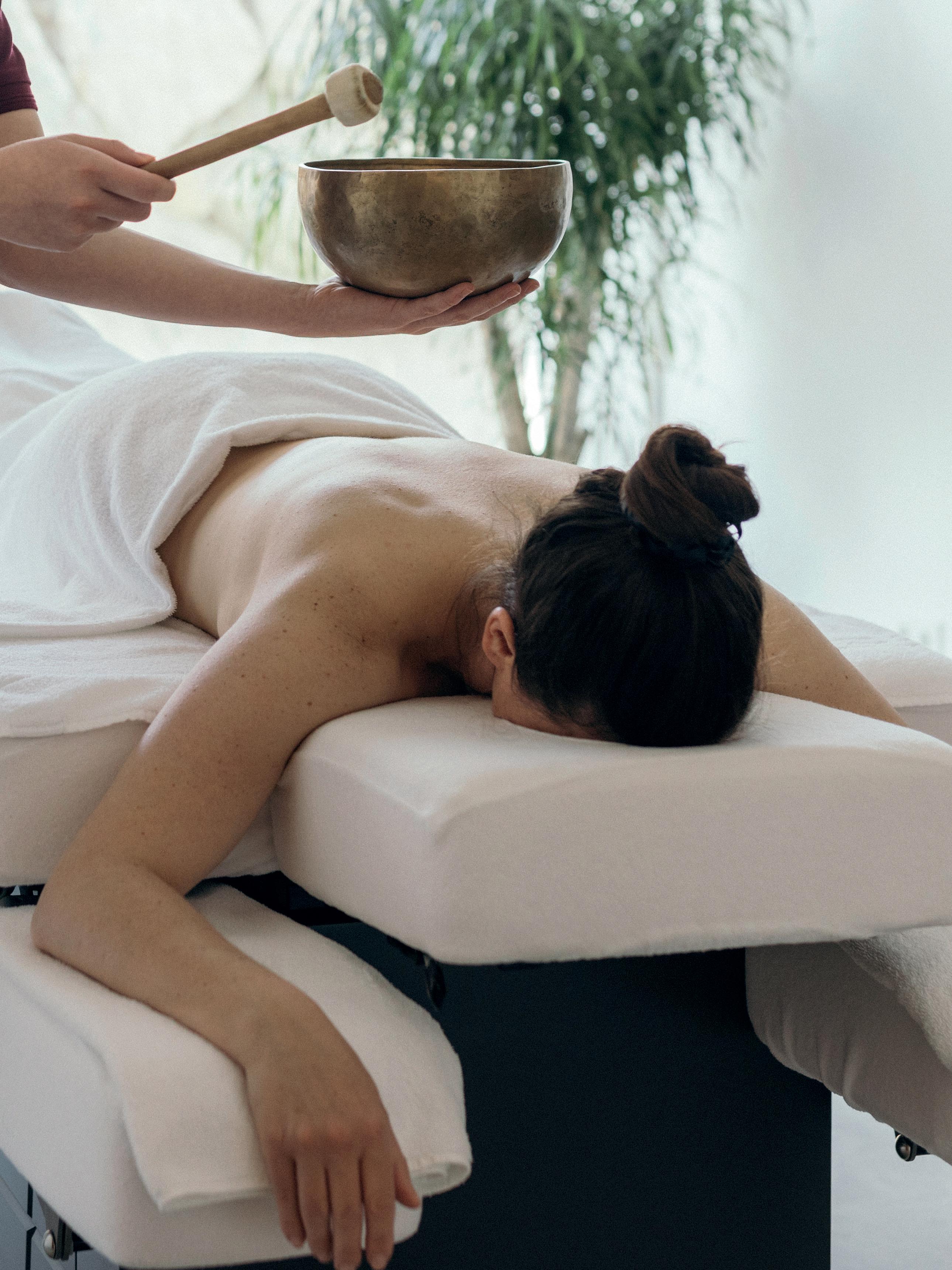 Bei der Klangschalenmassage werden die Klanginstrumente direkt auf den Körper gesetzt. Die Vibrationen der Klänge wirken direkt auf Muskulatur und Organsystem, während die auditive Wahrnehmung der Klänge den Geist entspannt und die Seele zur Ruhe bringt.
