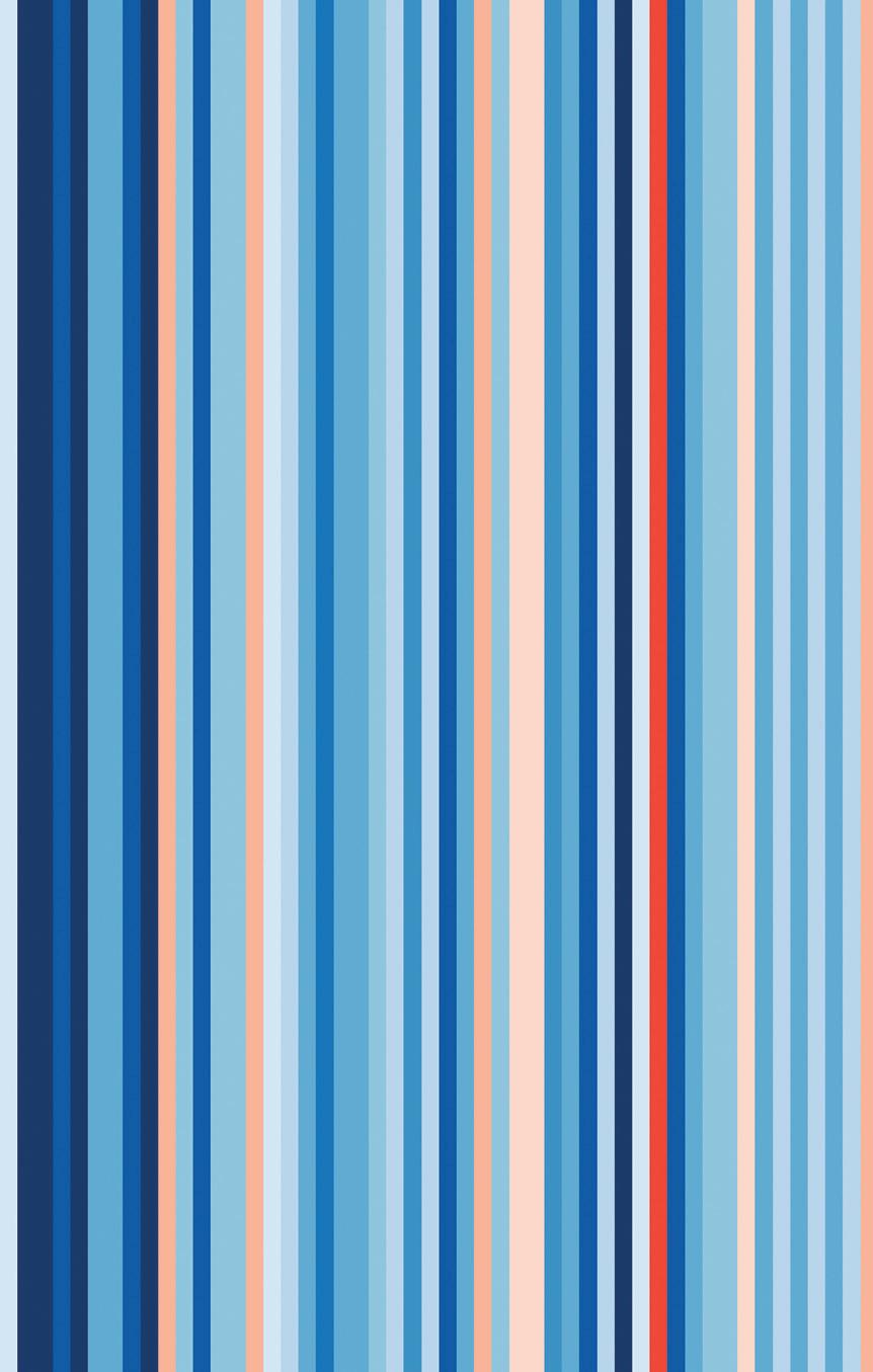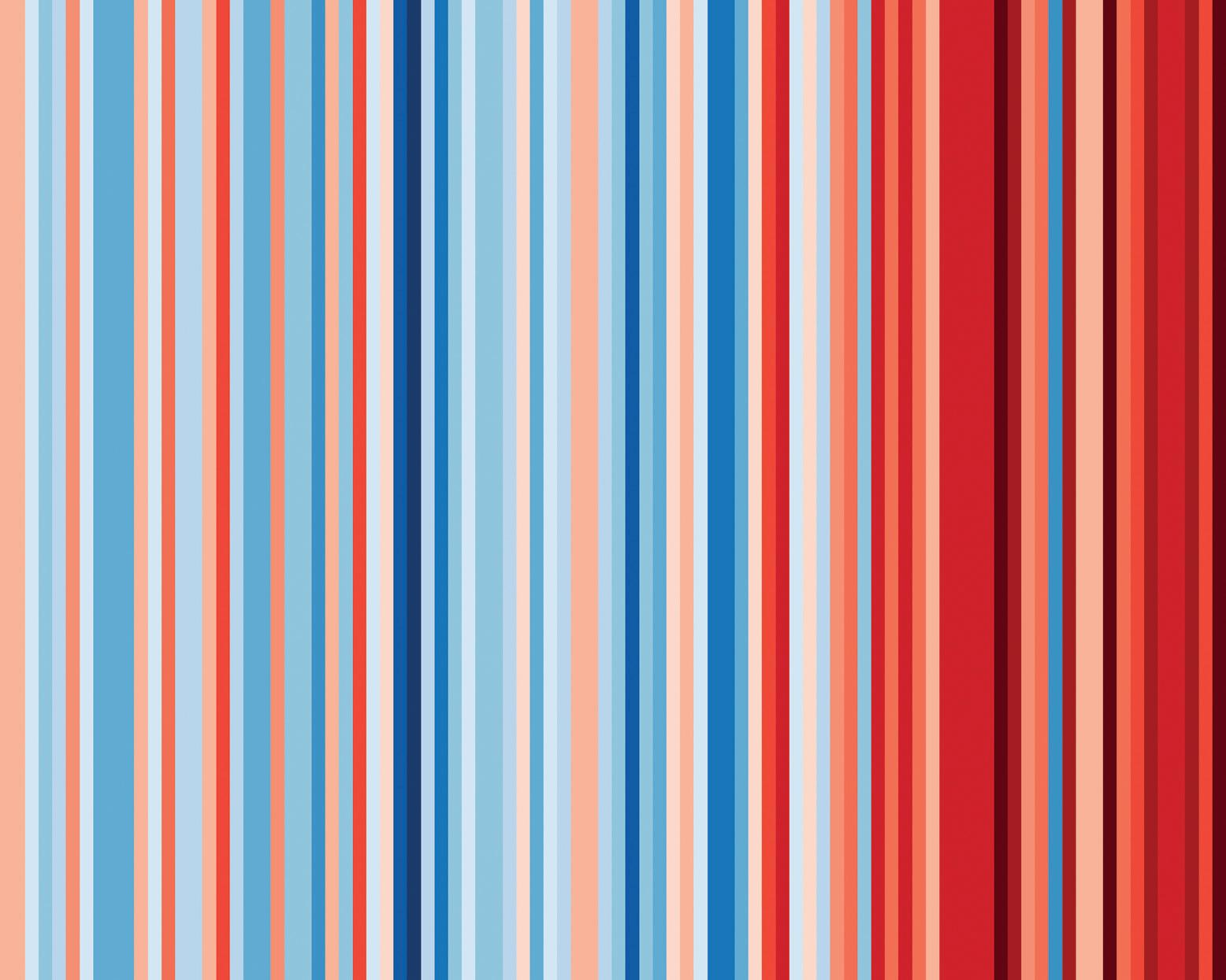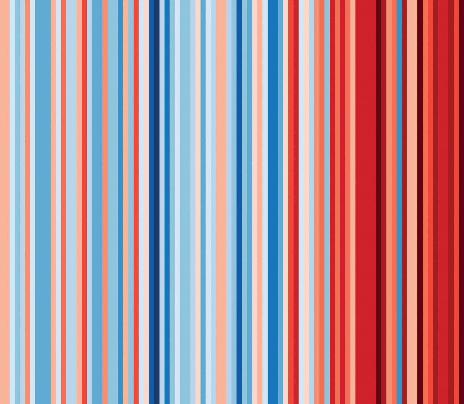 In 2018 I was invited to an event at the Hay Festival, which has a predominantly artistic rather than scientific audience. I was wondering about what I could show them that was easy to understand, visually compelling and felt relevant. I was inspired by a striped blanket that my colleague, Ellie Highwood, had made. I remembered discussing what information a blanket, or stripes, could convey and this led to creating a visual where each stripe represents the average temperature for a single year, relative to the average temperature over the period as a whole. Blue stripes indicate coolerthan-average years and red hotterthan-average. I put together the data for the globe but also for the town of Hay itself.