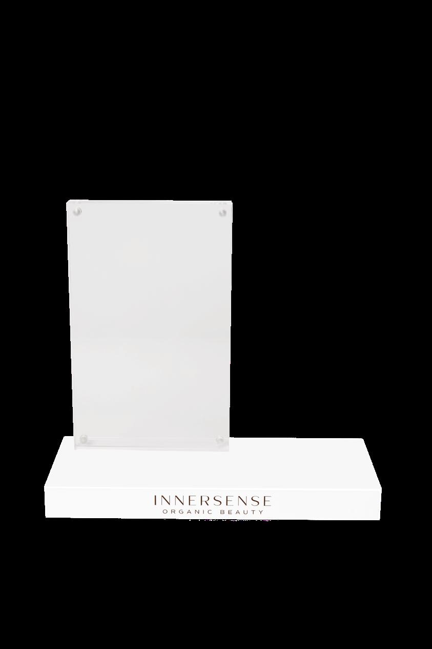 DESCRIPTION: Evergreen shelf signage to educate guests about Innersense. Compatible with the Shelf Sitter Frame.