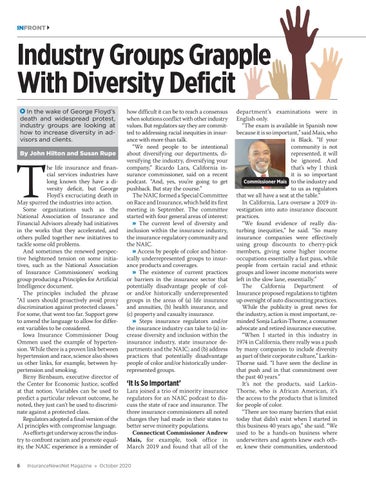 how difficult it can be to reach a consensus when solutions conflict with other industry values. But regulators say they are committed to addressing racial inequities in insurance with more than talk. “We need people to be intentional about diversifying our departments, diversifying the industry, diversifying your company,” Ricardo Lara, California insurance commissioner, said on a recent podcast. “And, yes, you’re going to get pushback. But stay the course.” The NAIC formed a Special Committee on Race and Insurance, which held its first meeting in September. The committee started with four general areas of interest: » The current level of diversity and inclusion within the insurance industry, the insurance regulatory community and the NAIC. » Access by people of color and historically underrepresented groups to insurance products and coverages. » The existence of current practices or barriers in the insurance sector that potentially disadvantage people of color and/or historically underrepresented groups in the areas of (a) life insurance and annuities, (b) health insurance, and (c) property and casualty insurance. » Steps insurance regulators and/or the insurance industry can take to (a) increase diversity and inclusion within the insurance industry, state insurance departments and the NAIC; and (b) address practices that potentially disadvantage people of color and/or historically underrepresented groups.